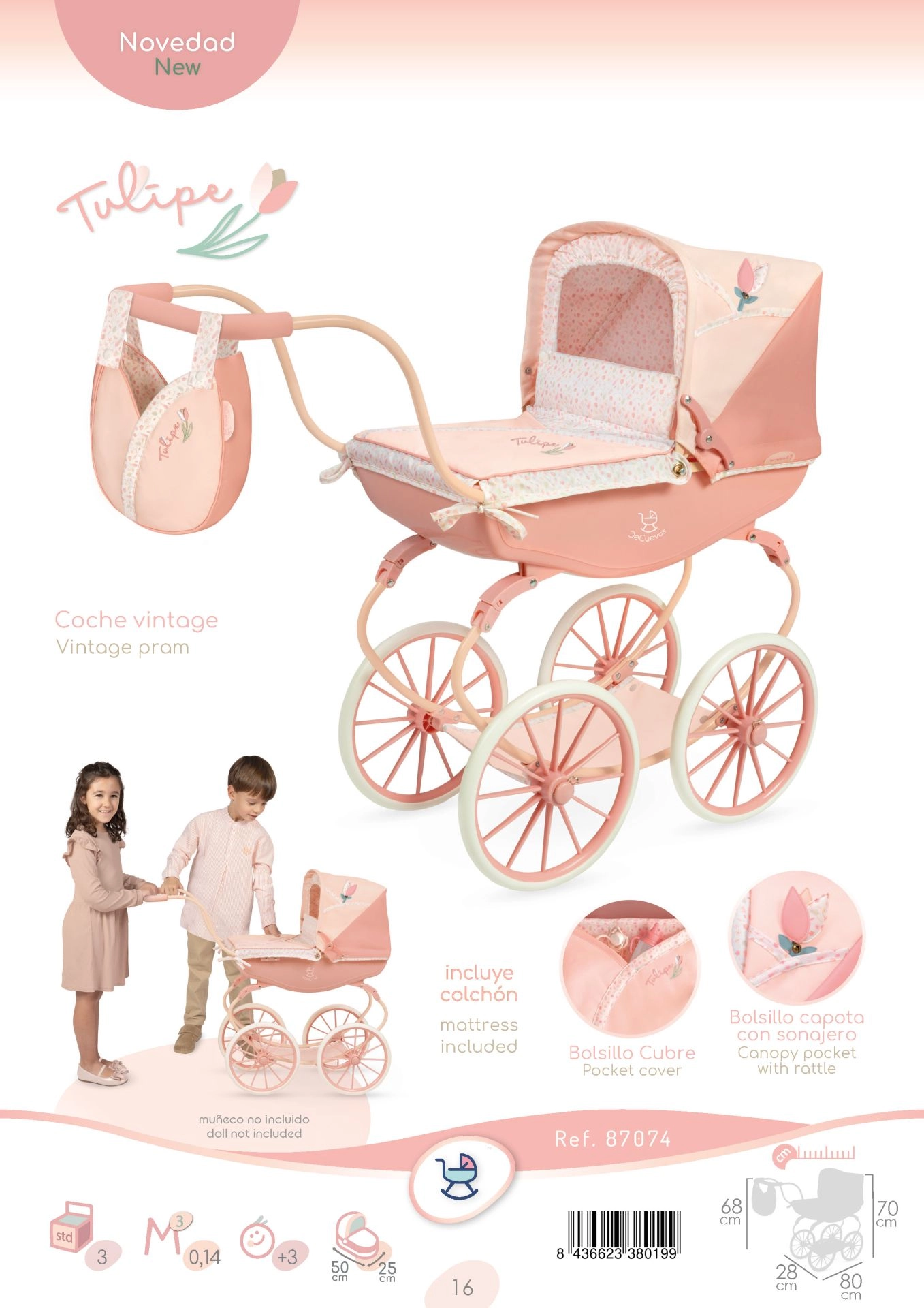 Elegantne DeCuevas Tulipe nukuvanker, käepideme kõrgus 68 cm, köidab kauni Hispaania disainiga soojades pastelltoonides. See pakub kokkupandavat kapuutsi, vedrudel õõtsumist, eemaldatavat tulpakujulist kotti ja praktilist panipaika tarvikutele. Ideaalne lastele alates 3. eluaastast ning kõigile, kes armastavad stiilseid lisandeid lastetuppa.