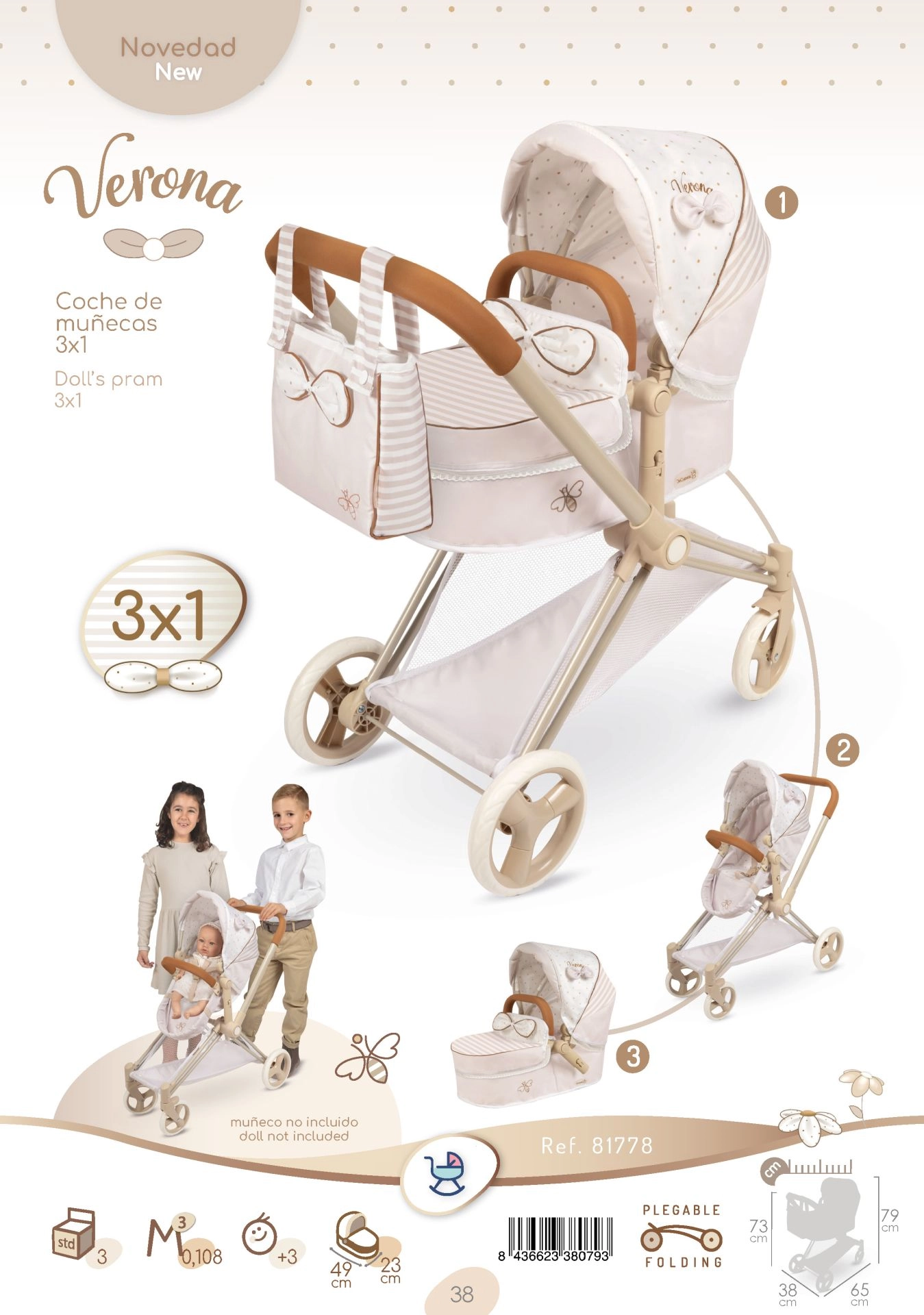 Elegantne 3‑ühes nukuvanker kollektsioonist VERONA rõõmustab maheda loodusliku disaini, kokkupandava raami ja eemaldatava sügava vankrikorviga, mida saab muuta sportraviks. Pakub reguleeritavat kapuutsi, kolmepunktirihma, pöörlevaid esirattaid lihtsaks juhtimiseks ning praktilist kotti ja panipaigakorvi. Suurepärane valik lastele alates 3. eluaastast.