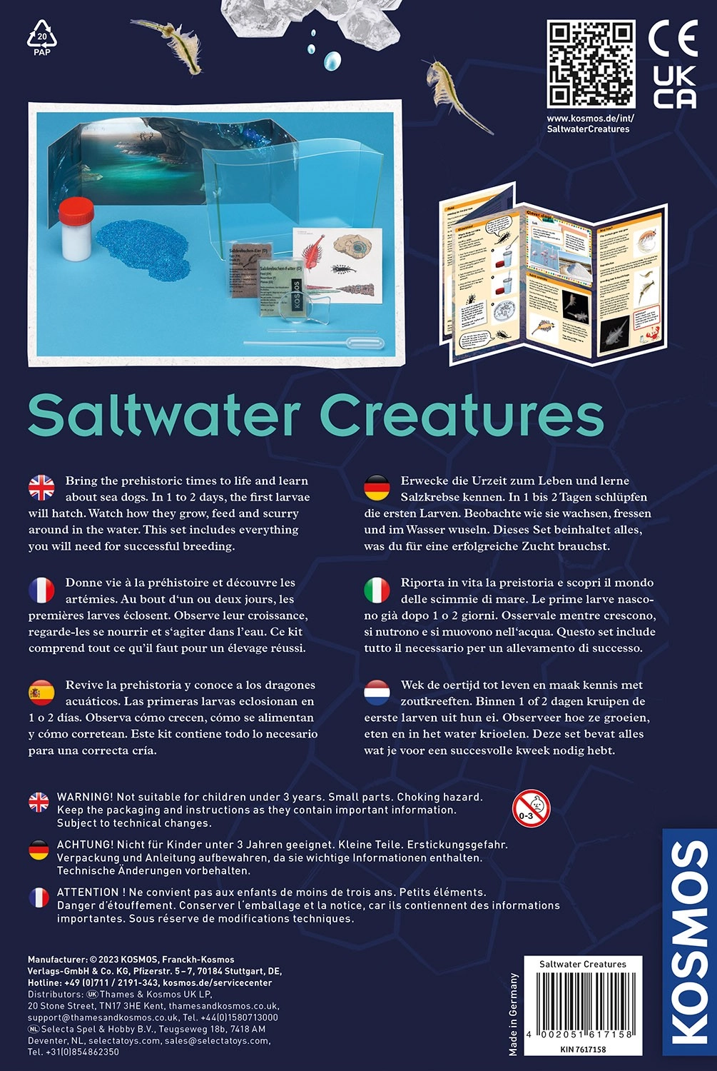 Avastage põnev väikeveeolendite maailm hariva Kosmos komplektiga soolvee artemiate kasvatamiseks. Komplektis on kõik lihtsaks alustamiseks vajalik: paak, erisool, sööt, munad ja eesti juhend allalaaditavana läbi QR-koodi. Ideaalne kingitus 8–12-aastastele, mis toetab tutvumist looduse ja teadusega.