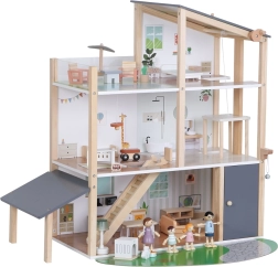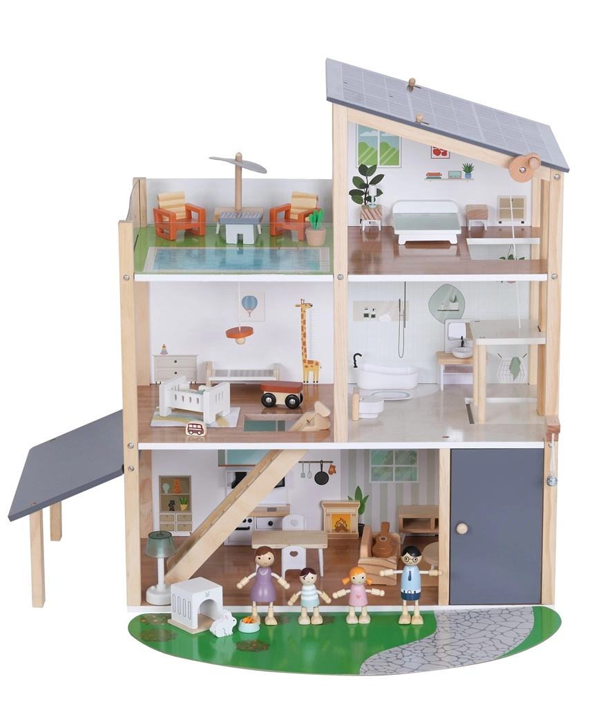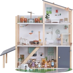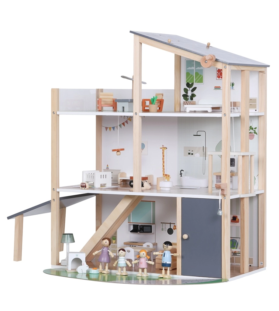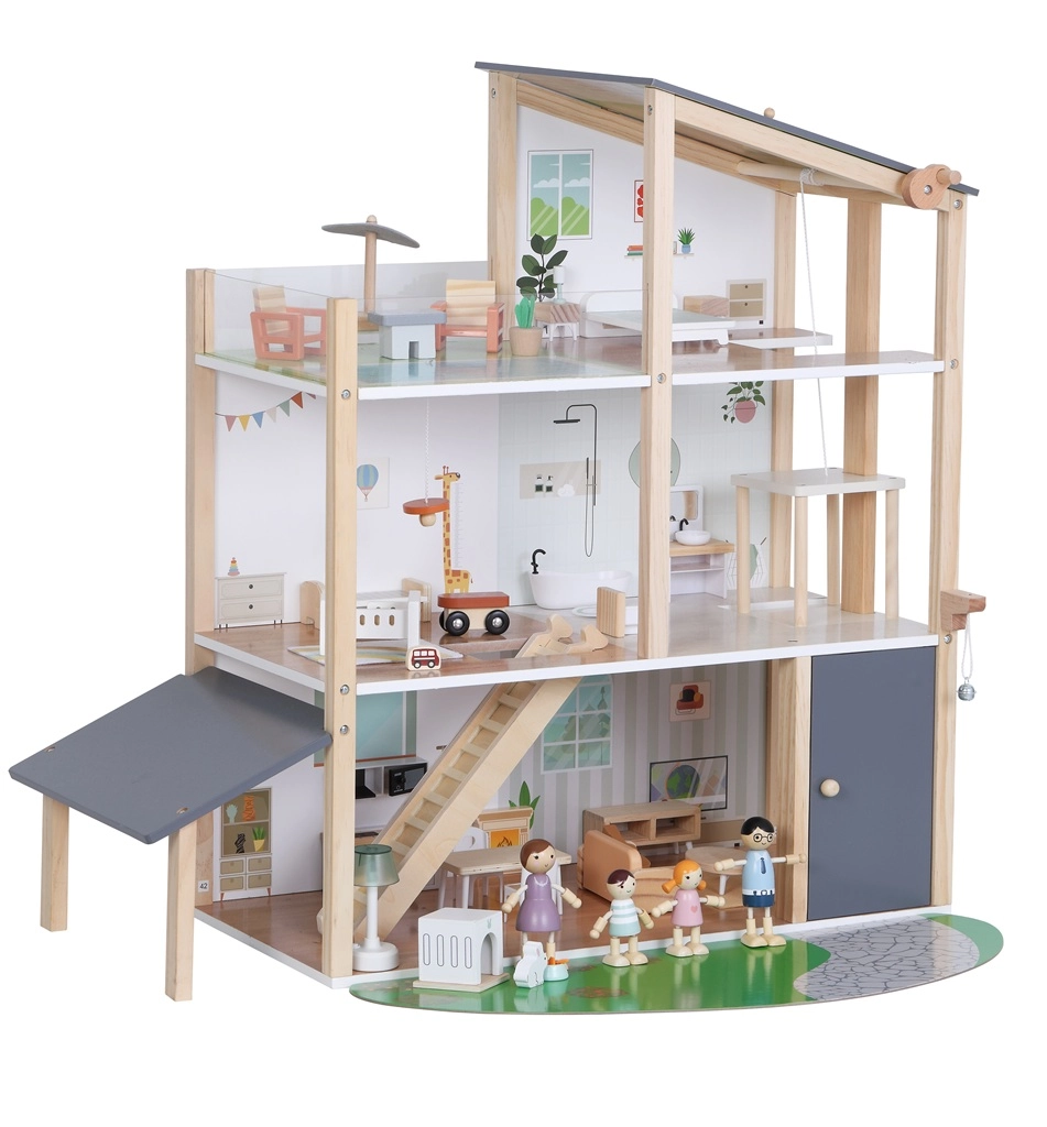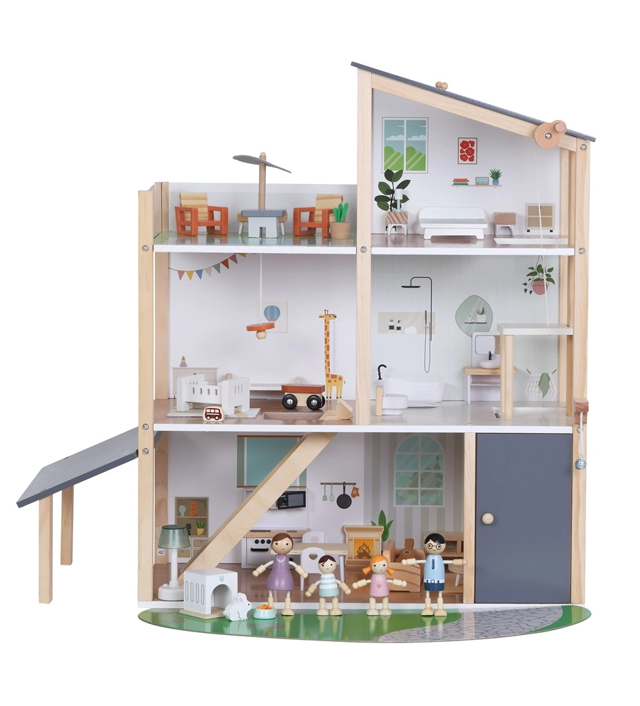 See modernne puidust nukuhaus pakub kõike, mida lapsed armastavad: kööki, mis on ühendatud elutoaga, stiilset vannituba vanniga, lastetuba, magamistuba ja avarat katuseterrassi. Mänguline disain, mahedad toonid ja kvaliteetne teostus muudavad maja kauniks täienduseks lastetuppa või mängutuppa.