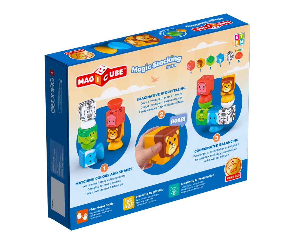 Magnetiline ehituskomplekt Geomag Magicube Safari pakub lastele mängulist ja turvalist teed konstruktsioonimaailma avastamiseks. Tänu tugevatele magnetitele ühenduvad kuubid ja poolkerad hõlpsasti kõigilt külgedelt, nii et isegi kõige väiksemad ehitajad saavad kokku panna loomakesi, sõidukeid ja fantaasiarikkaid vorme. Võit Nürnbergi mänguasjamessil kategoorias Baby & Infant 2025 kinnitab selle kvaliteeti ja populaarsust.