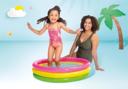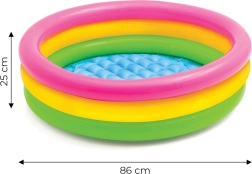 INTEX täispuhutav bassein toob lastele veemängurõõmu otse teie aeda. Tänu kompaktsetele mõõtudele 86 × 25 cm mahub see peaaegu kõikjale ning madal veetase 17 cm suurendab pisemate turvatunnet. Vikerkaarevärvides kujundus on pilkupüüdev ja kutsub mängima.
