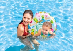 Kerge ja vastupidav INTEXi täispuhutav rõngas läbimõõduga 61 cm on suurepärane veemängudeks ja esimesteks sammudeks ujumise õppimisel. Valmistatud vastupidavast PVC-st (0,18 mm), värviliste motiivide ja mugava haardega. Muster valitakse juhuslikult.