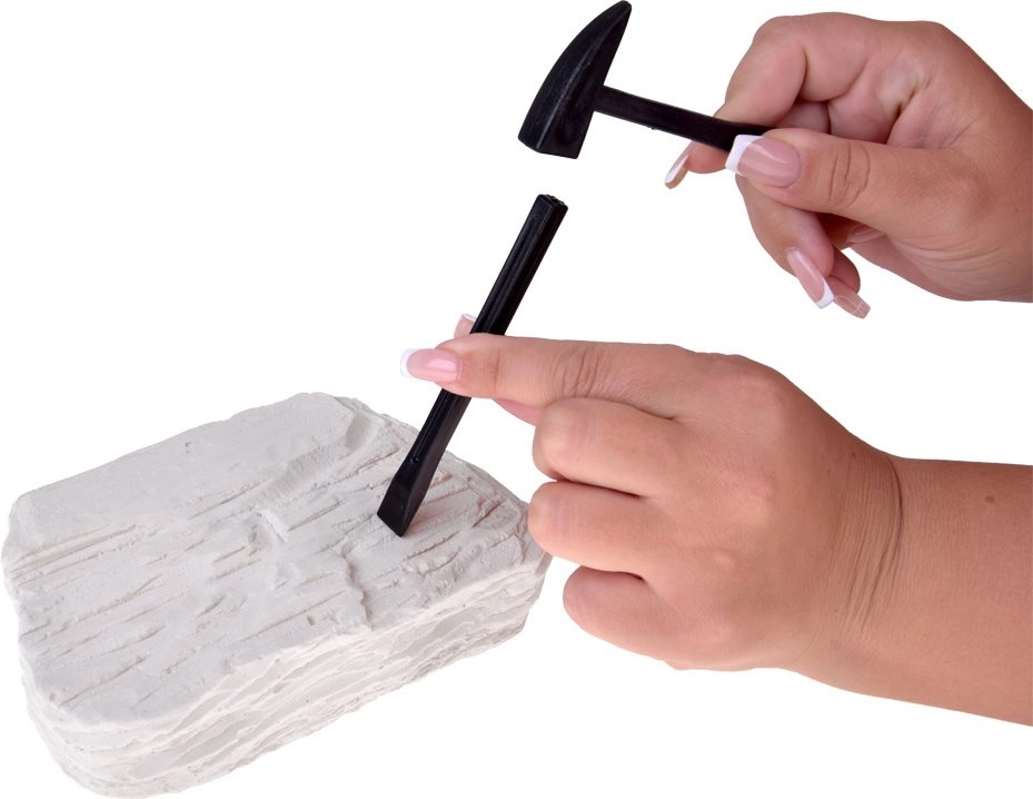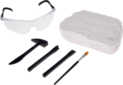 Komplekti kuuluvad vastupidav kipsplokk ja kaitseprillid, mis kaitsevad silmi fossiili paljastamisel. Ideaalne turvaliseks koduseks arheoloogiaks.