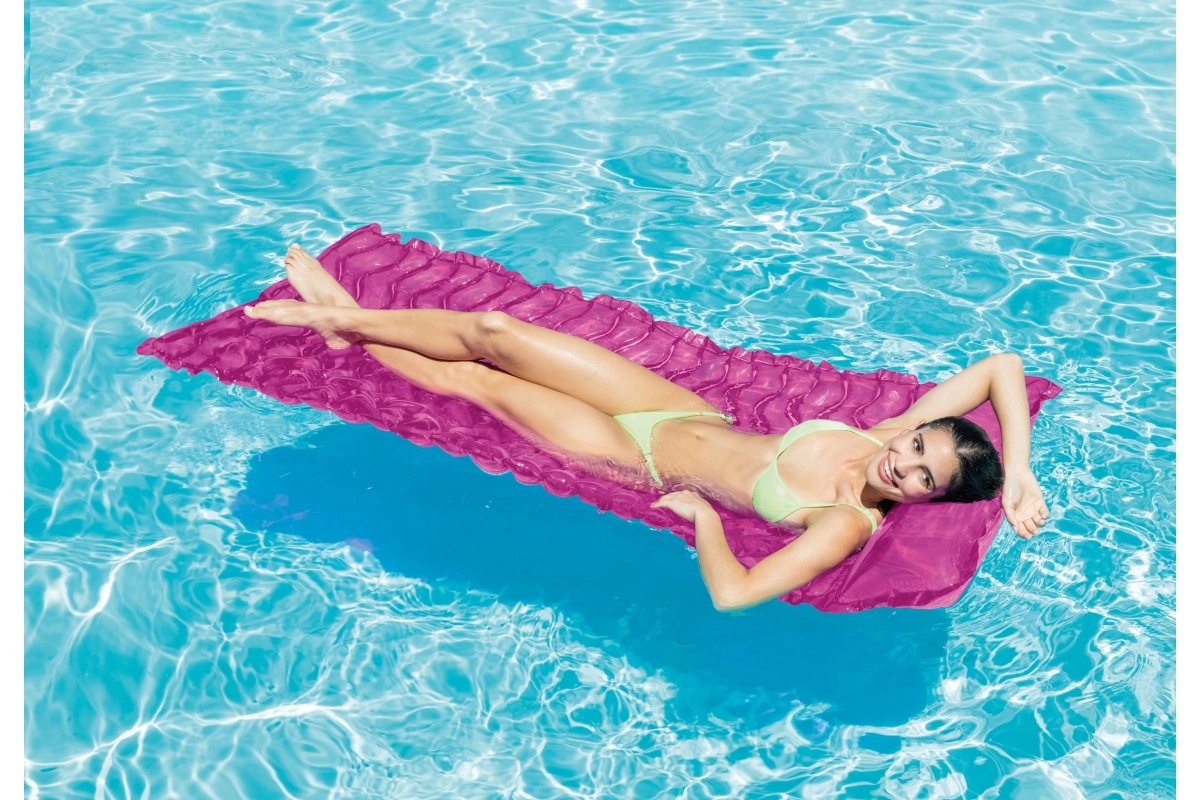 Lainelise disainiga täispuhutav madrats sobib suurepäraselt lõõgastumiseks nii basseini ääres kui ka puhkusel vee ääres. Lai lamamispind tagab mugavuse, integreeritud padi toetab kaela ja pead ning kvaliteetne vinüül peab vastu suverõõmudele. Kahe kambriga konstruktsioon lisab veepinnal turvalisust ja stabiilsust.