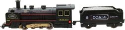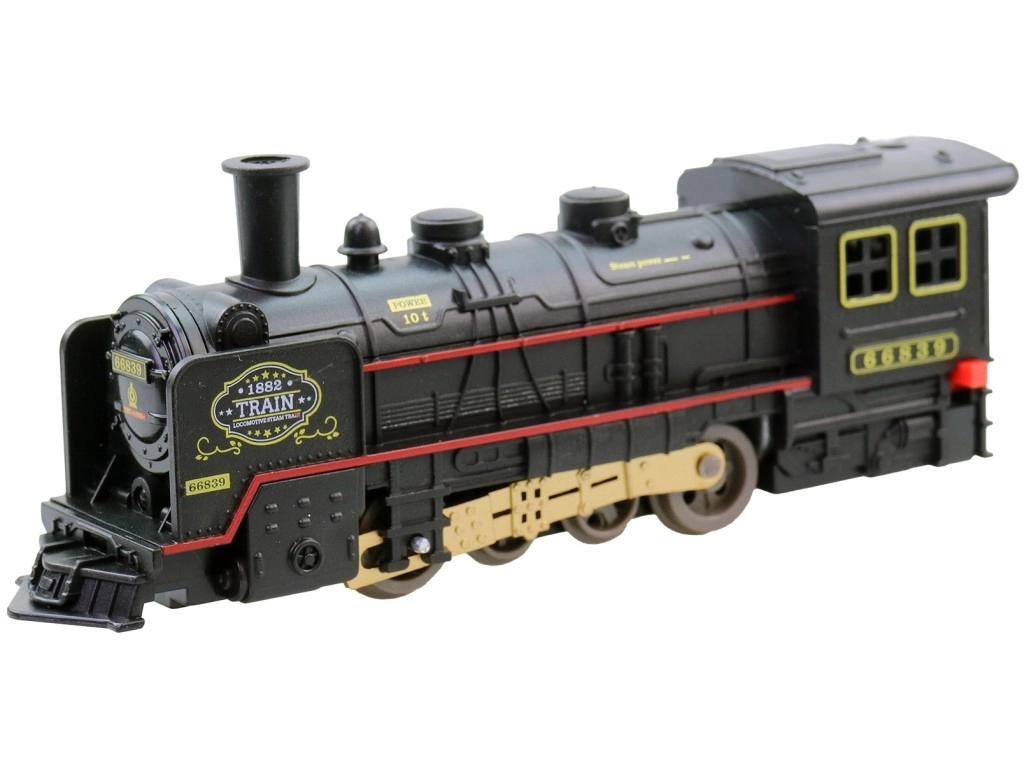 Must lokomotiiv punaste ja kuldsete elementidega, korstna ja pilkupüüdvate ratastega lisab igale sõidule ehtsa raudtee meeleolu.