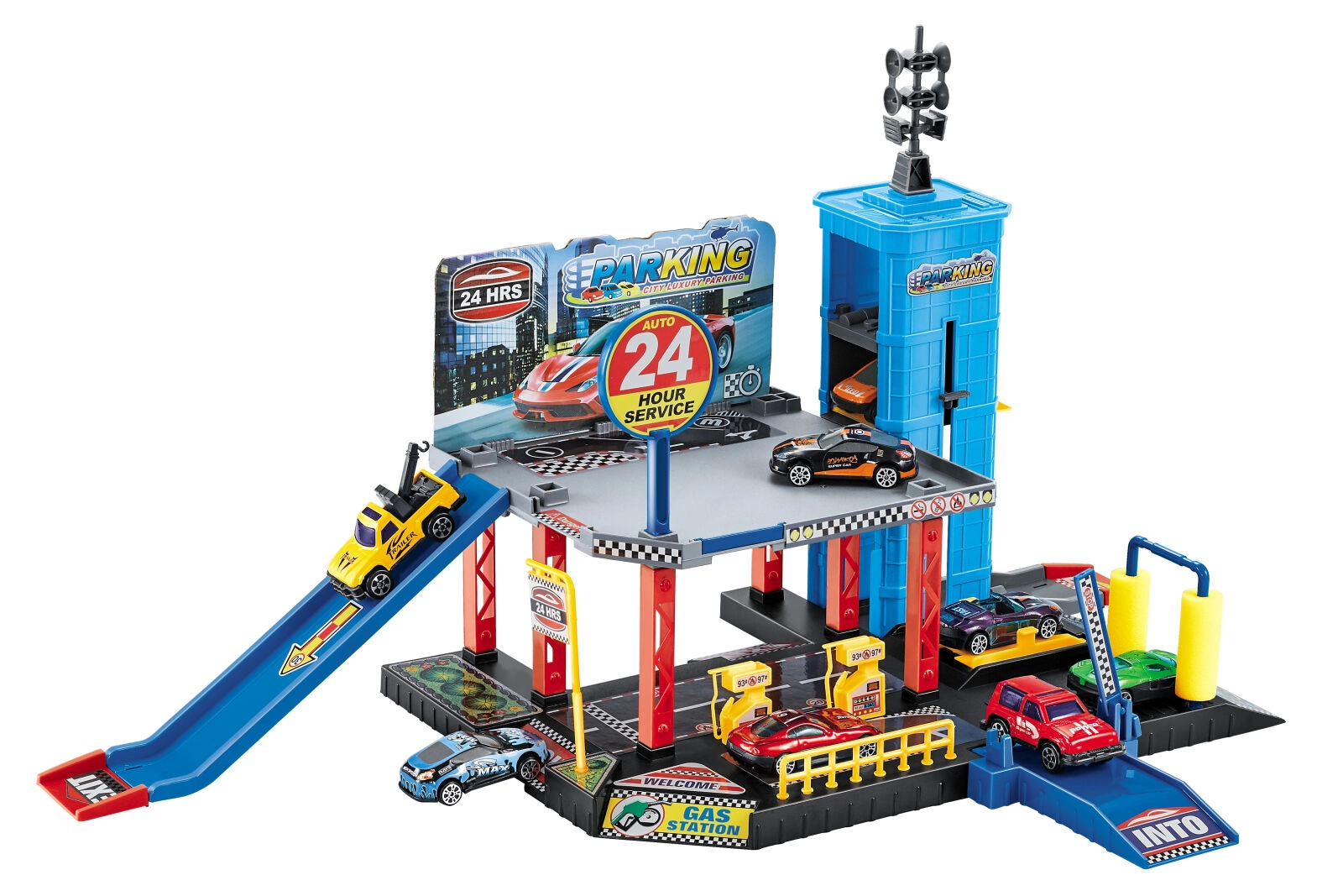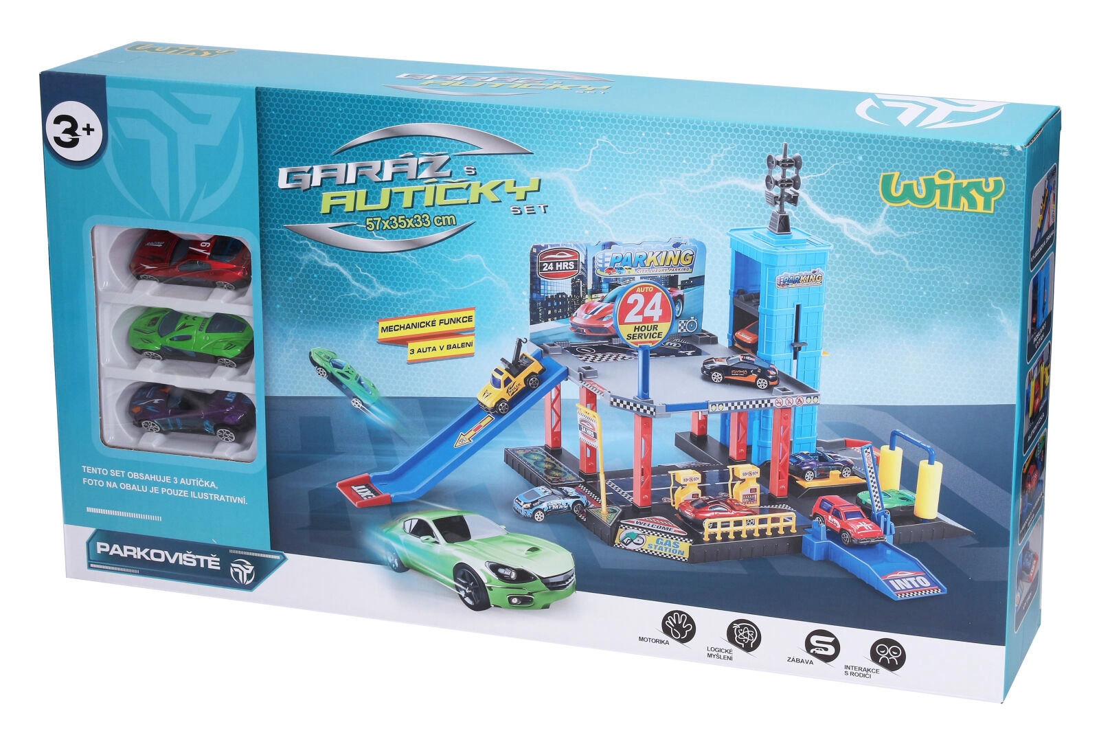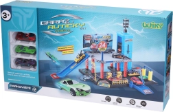 - Täielik komplekt koheseks mänguks – garaaž, lift, tankla ja 3 autot