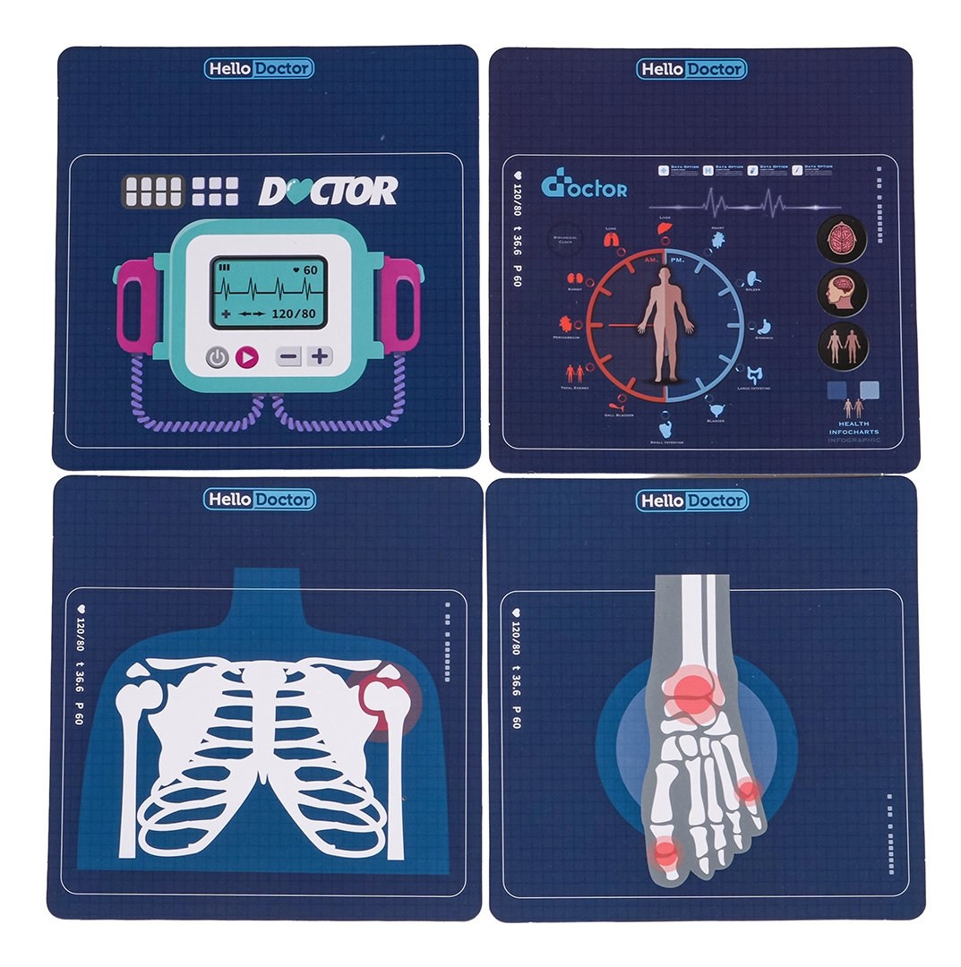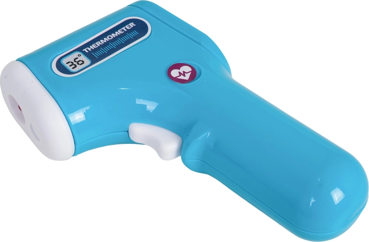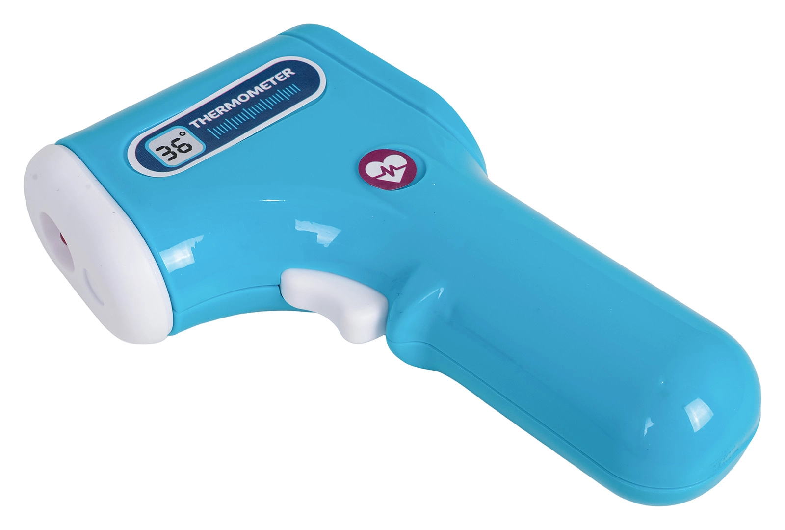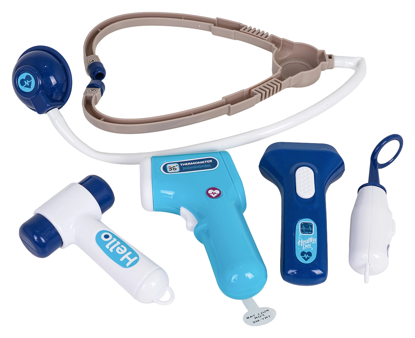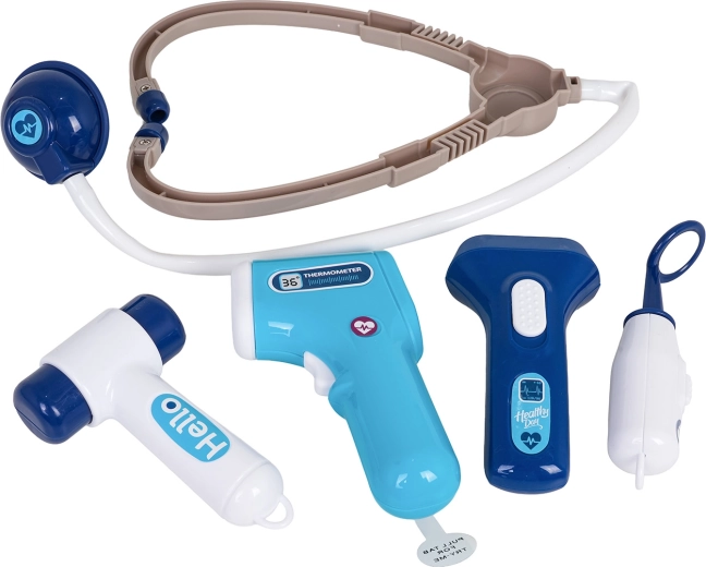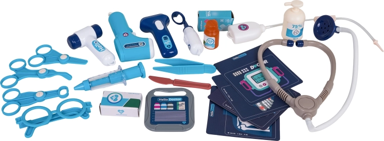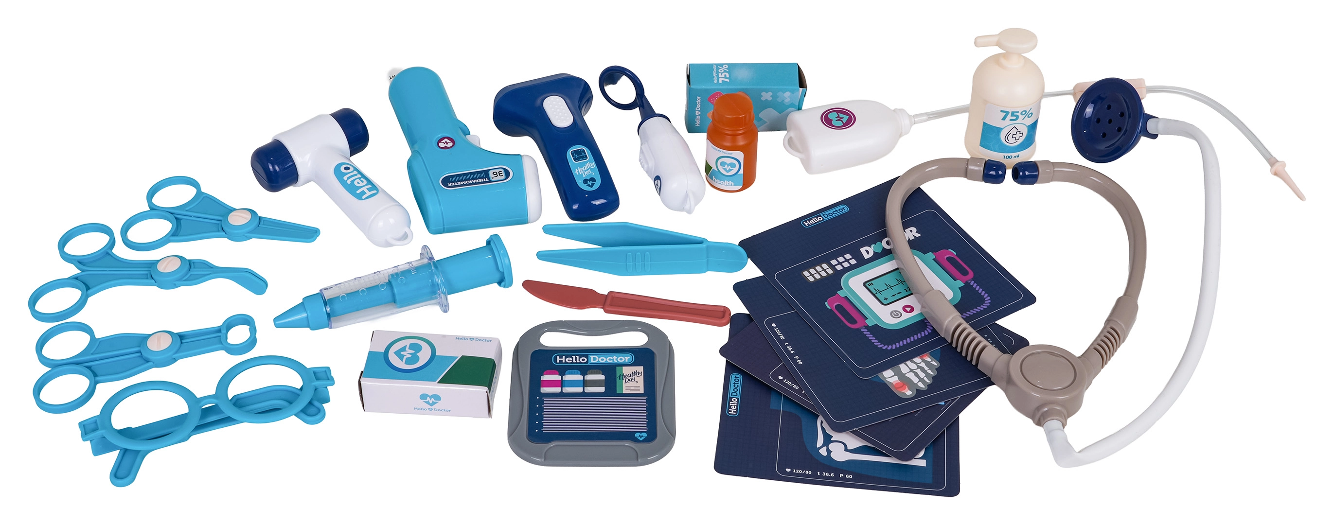 Stetoskoop, kontaktivaba valgustusega termomeeter, süstal, käärid, pintsetid, peegel, vasar, prillid, patsiendikaart ja muud lisad loovaks mänguks.