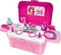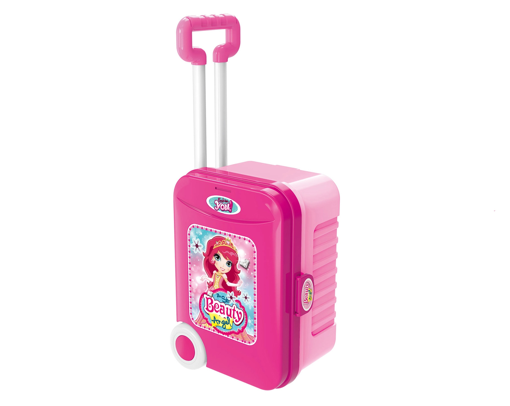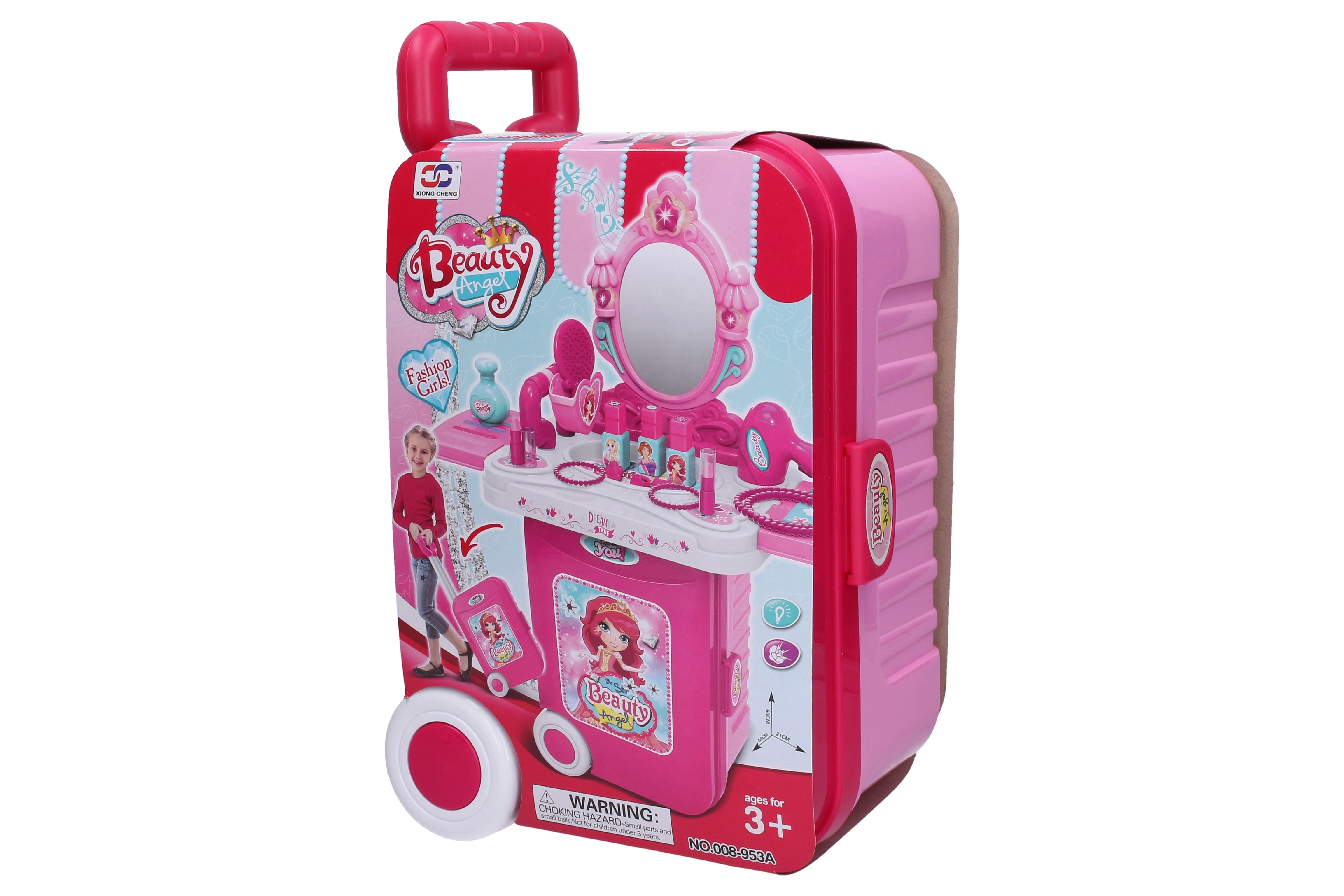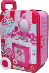 See roosa kosmeetikakomplekt on ideaalne väikestele ilutegijatele, kes armastavad fantaasiarikast rollimängu. Praktiline ratastega kohver teleskoopkäepidemega muutub hõlpsalt stabiilseks kosmeetikalauakeseks integreeritud peegliga. Samas pakub see piisavalt hoiuruumi kõigile tarvikutele.
