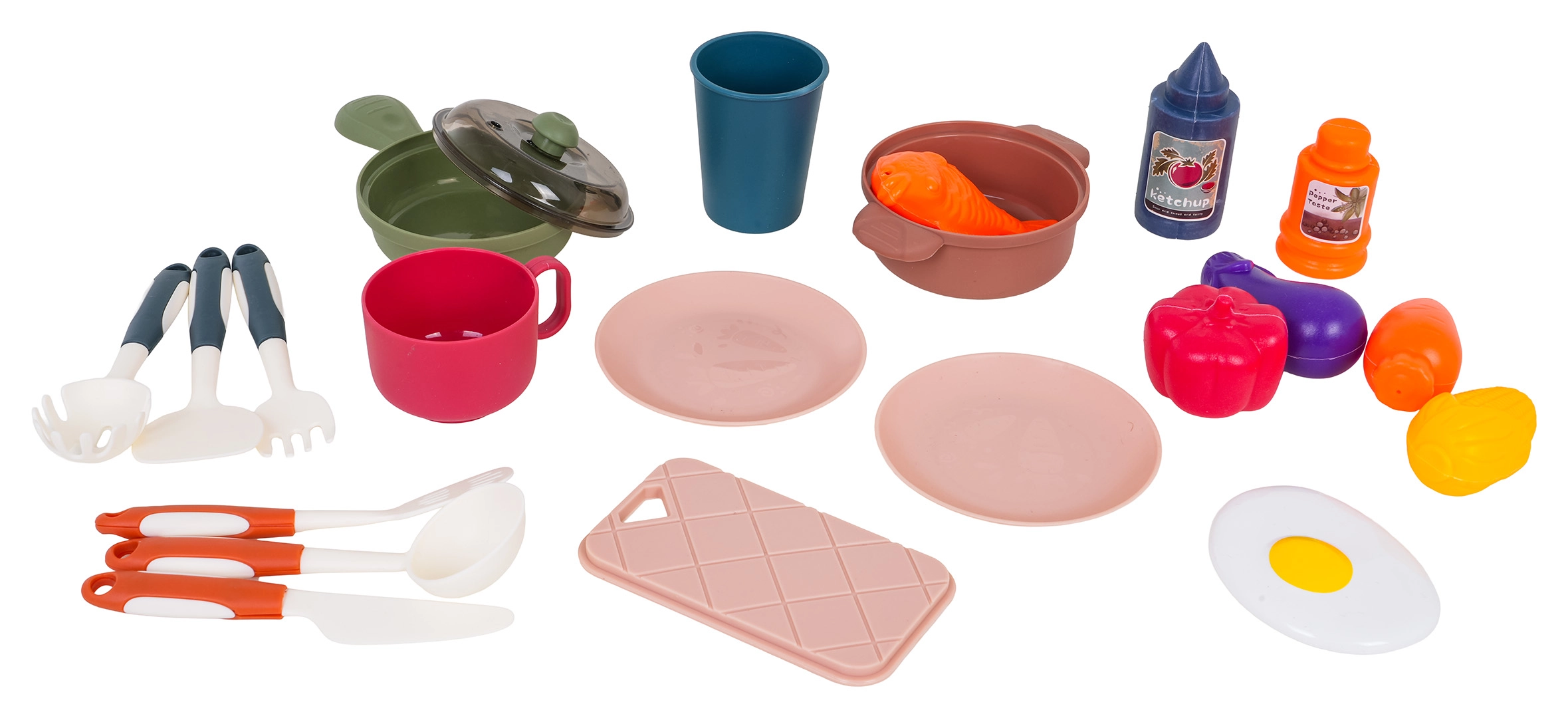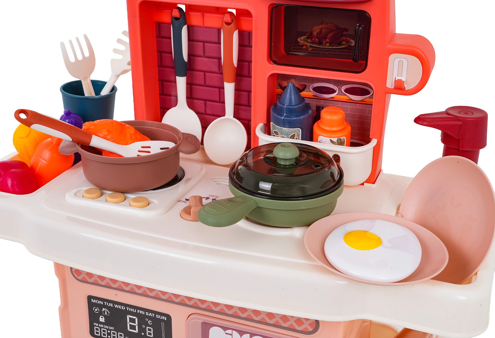 Tõeliseks tõmbenumbriks on toimiv kraan – patareitoitel pump suunab vee valamus voolama, nii et lapsed saavad “nõusid pesta” nagu päris köögis. Komplekti kuuluvad ka avatav ahi, kohvimasina imitatsioon ja valgustusega õhupuhasti. Rikkalik lisavarustus (potid, pann, riistad, taldrikud ja toiduained) laiendab mänguvõimalusi.