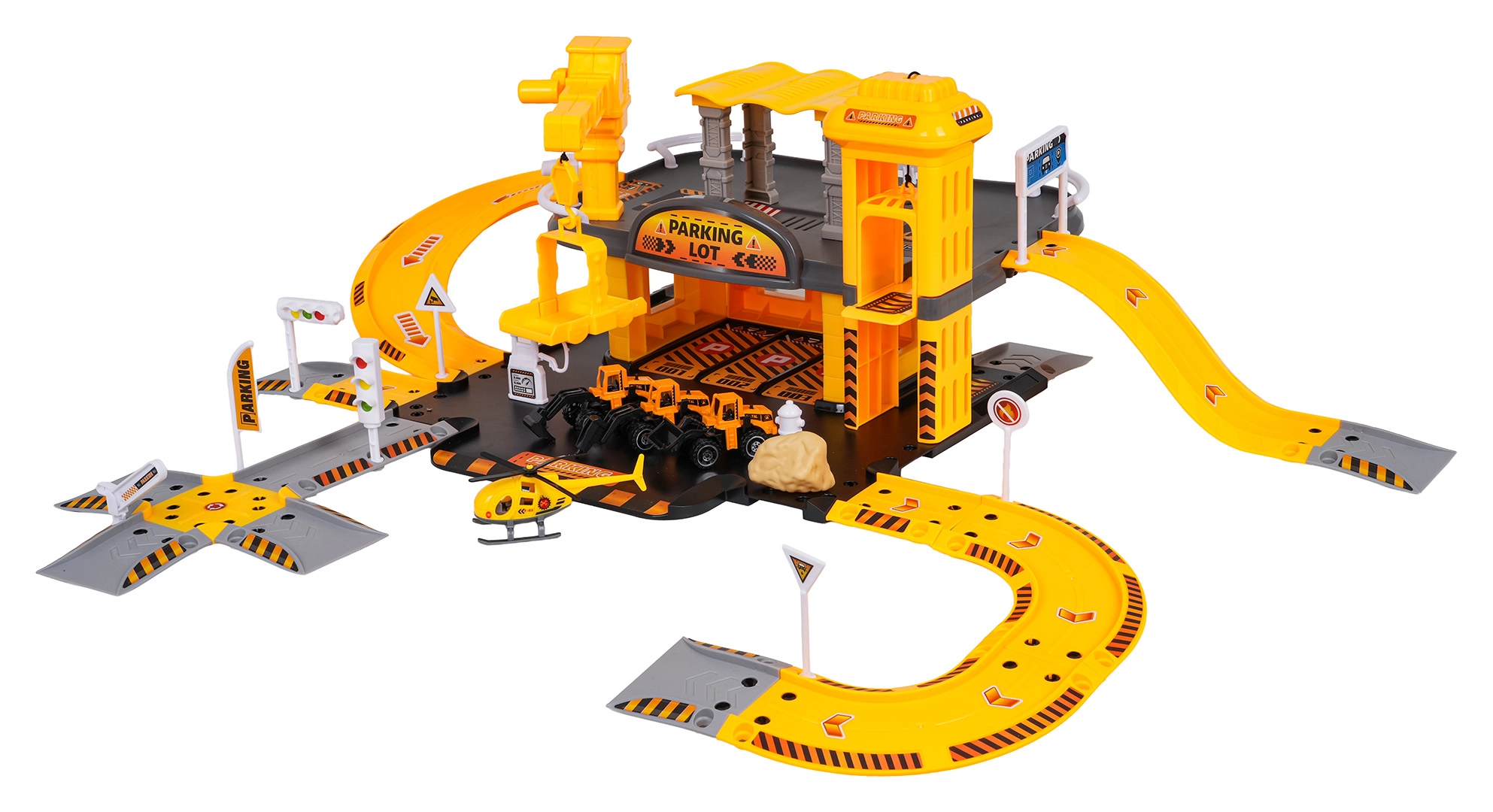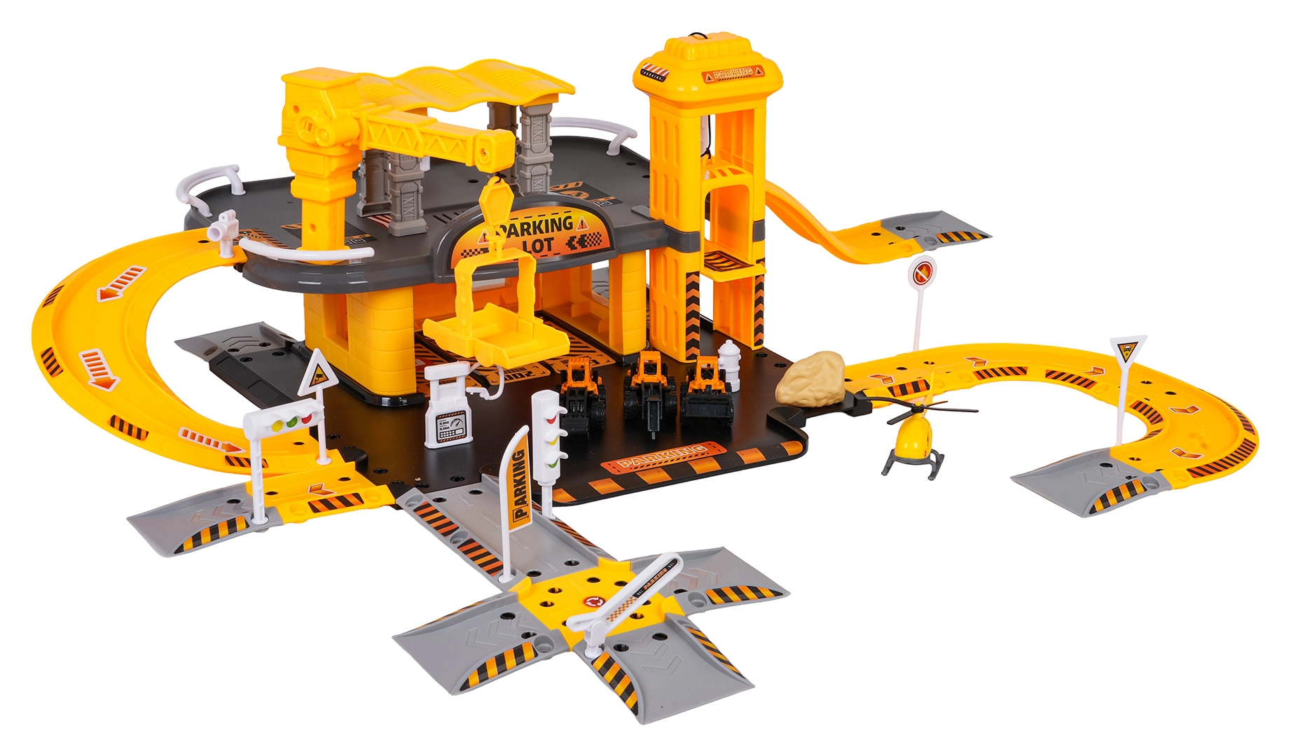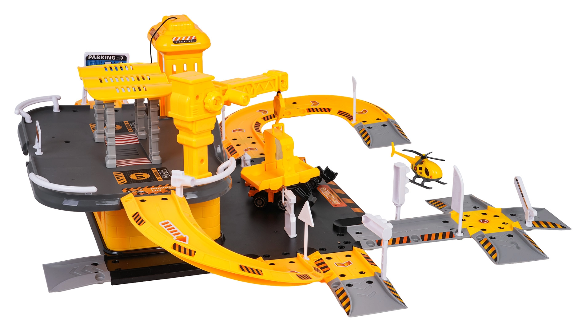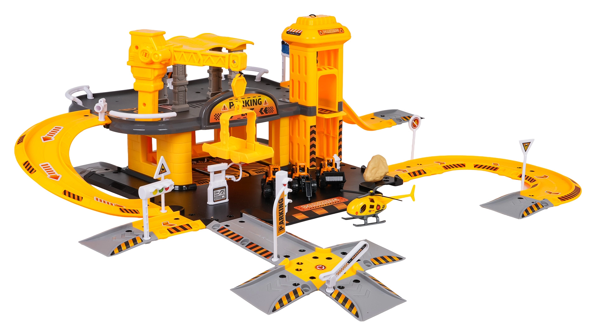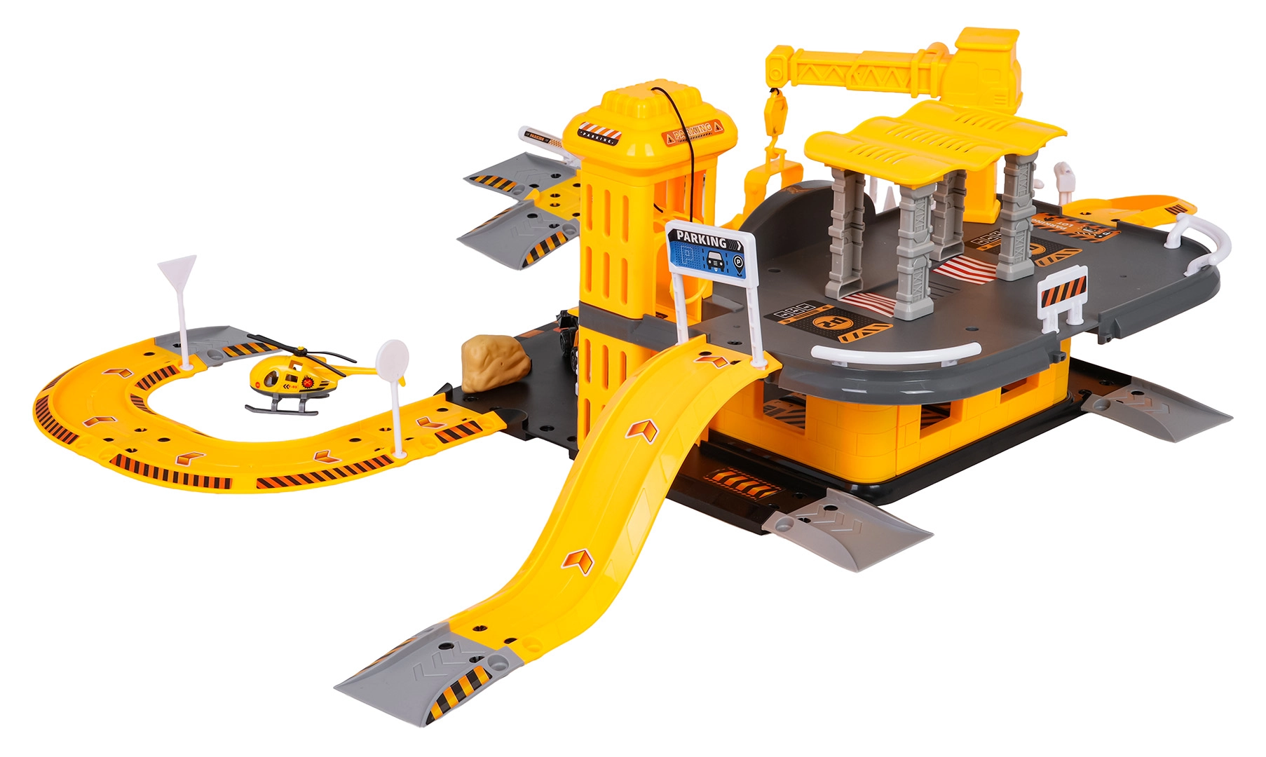 See detailirohke ehitusparkla rõõmustab kõiki väikseid ehitusmasinate fänne. Alumisel korrusel on tankla ja teed, käsilift viib sõidukid esimesse korrusesse, kus paikneb ehitustsoon töötava kraanaga. Komplekt on kompaktne, kuid pakub palju mänguvõimalusi ja sujuvat sõitu mööda keerdrampe.