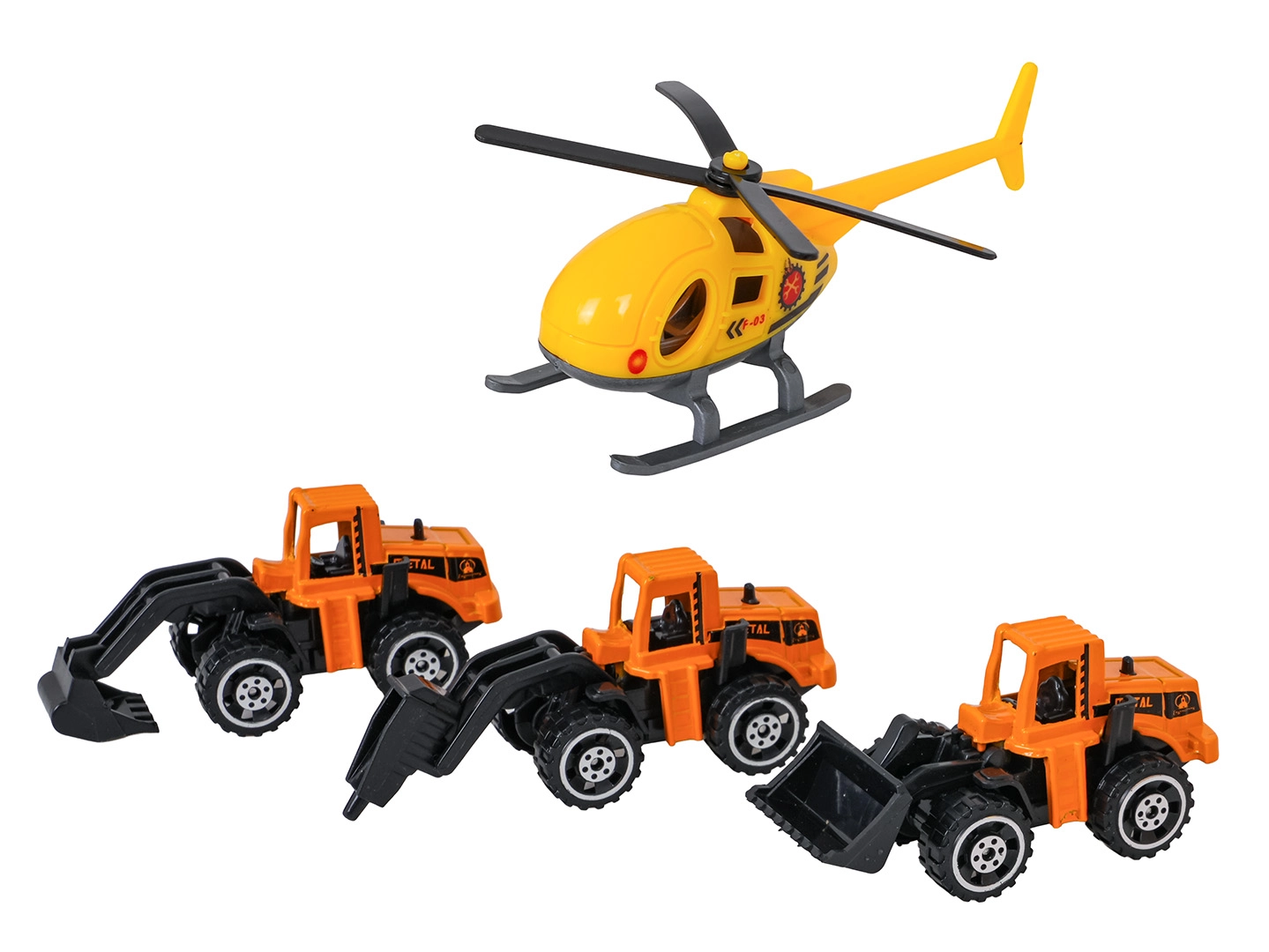Komplektis on 3 metallist väikest ehitusautot liigutatavate elementidega ja helikopter, liiklusmärgid, tõkked ja dekoratiivkleebised. Tänu vastupidavale teostusele ja ohututele materjalidele sobib komplekt igapäevaseks mänguks ning arendab peenmotoorikat, kujutlusvõimet ja koostööoskust.