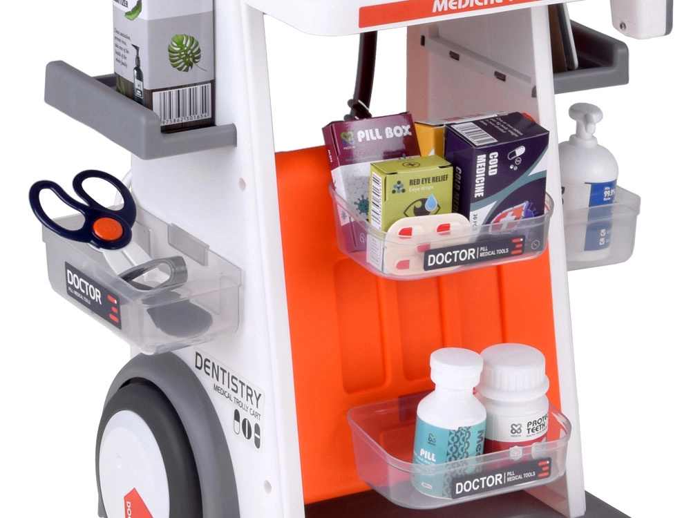 Tugev ratastel konstruktsioon, mitu riiulit ja vannikest tööriistade ning “ravimite” selgeks paigutamiseks. Lapsed saavad käru hõlpsalt kõikjale kaasa võtta ja hoida kõik käepärast.
