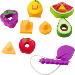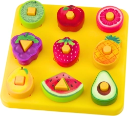 See hariv puuviljamotiiviga pusle ühendab mängu ja õppimise. 20 × 20 cm aluslaual sobitavad lapsed värvilisi geomeetriliste kujunditega tükke vastavatesse avadesse, omandades loomulikul viisil värvide, kujundite ja puuviljade tundmise. Komplektis on ka „uss“ läbitõmbamiseks, mis toetab veelgi enam peenmotoorikat ja keskendumist.