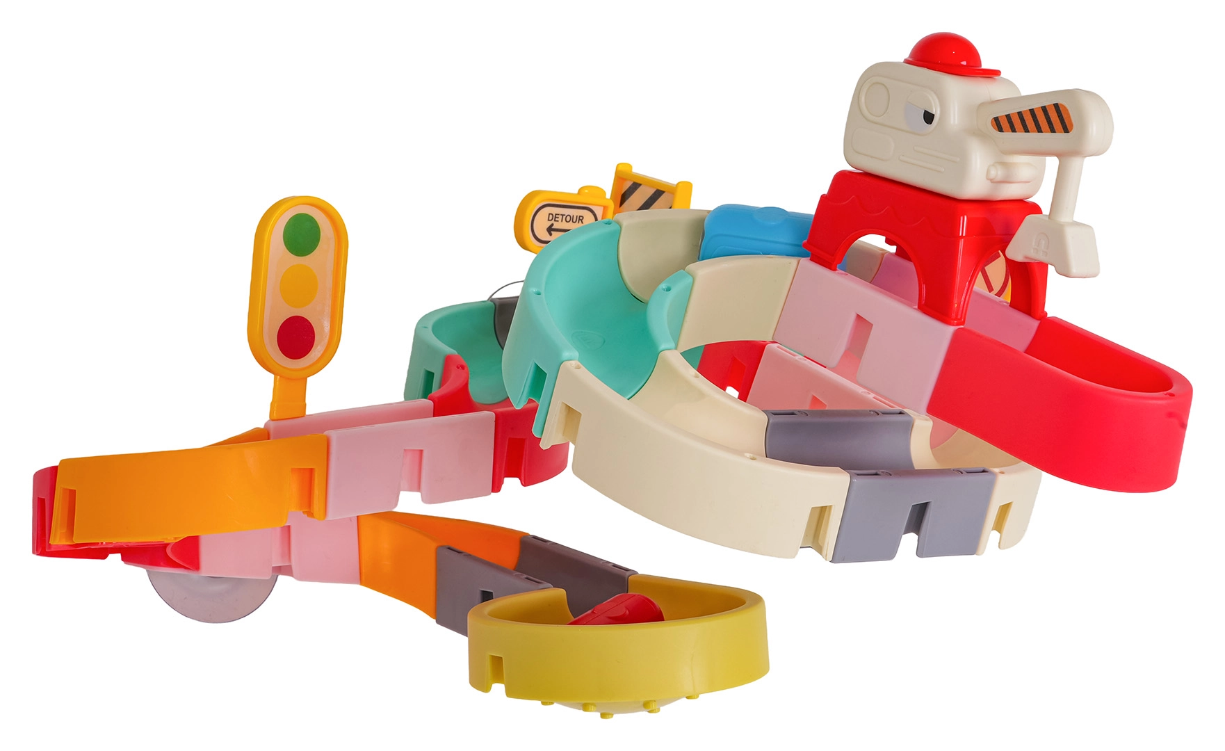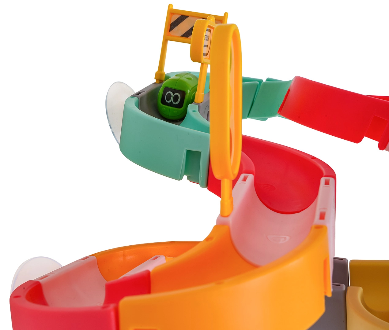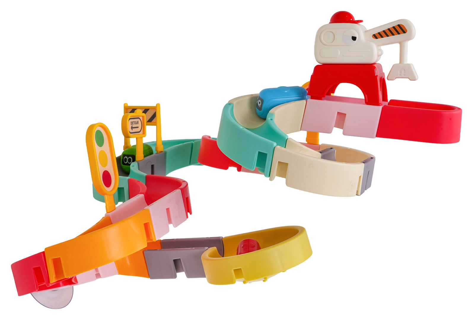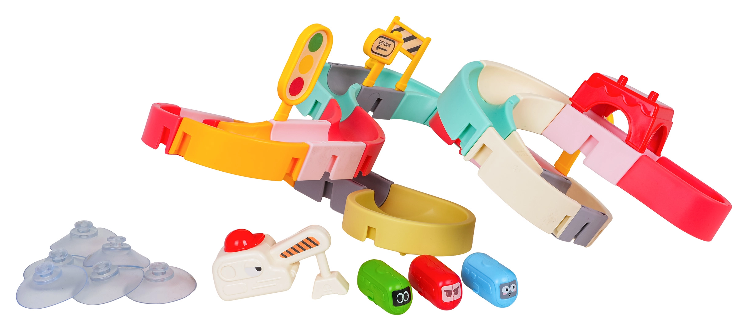 Lõbu on turvaline ja mitmekesine: kvaliteetne plast ilma teravate servadeta, tugevad iminapad stabiilsuseks ja erksad värvid, mis innustavad lapsi looma üha uusi radu. Komplekti kuuluvad ka liiklusmärgid, tõkkepuud ja kleebised veelgi suurema loovuse jaoks.