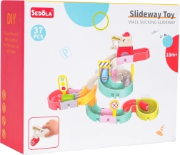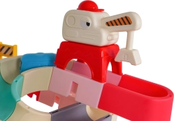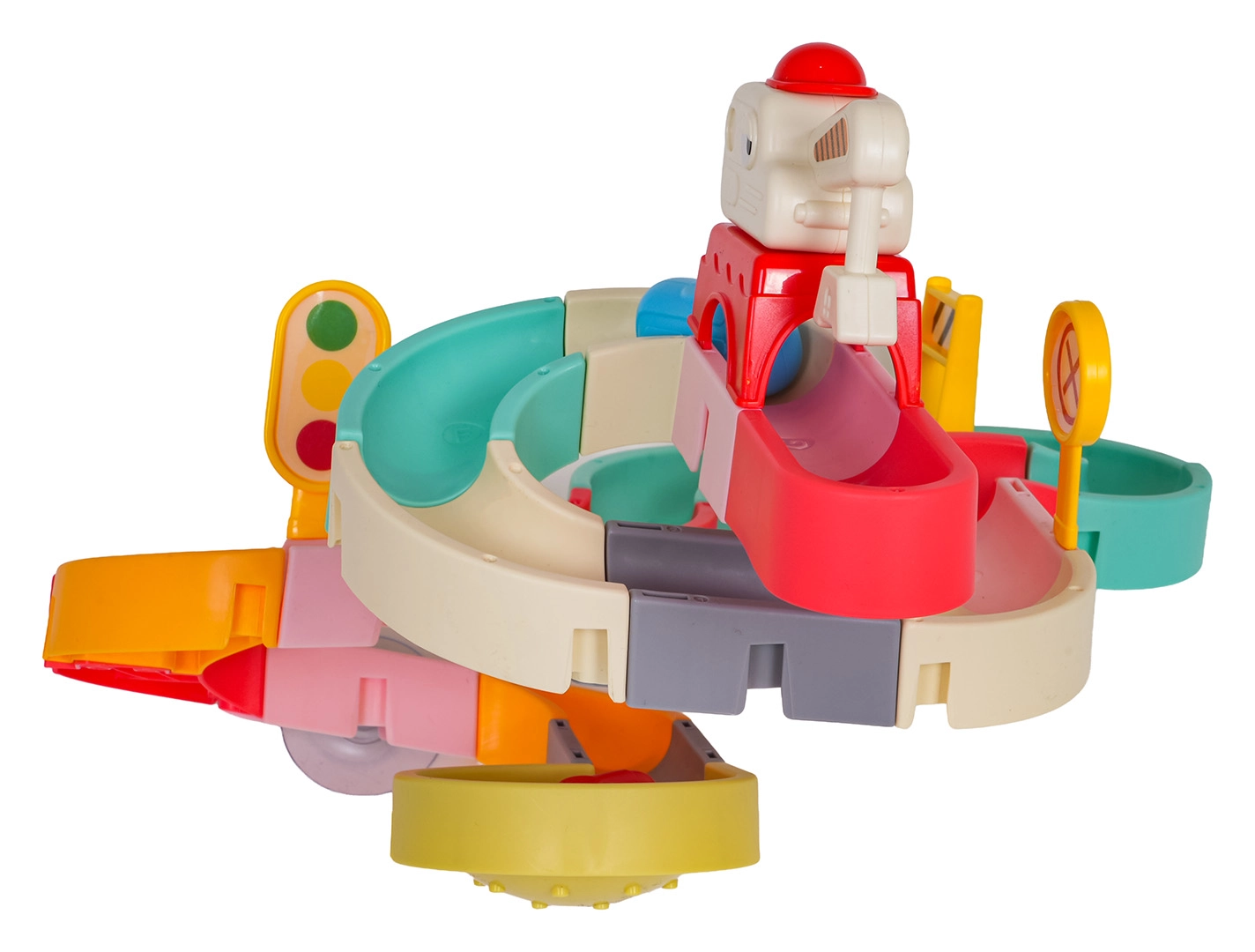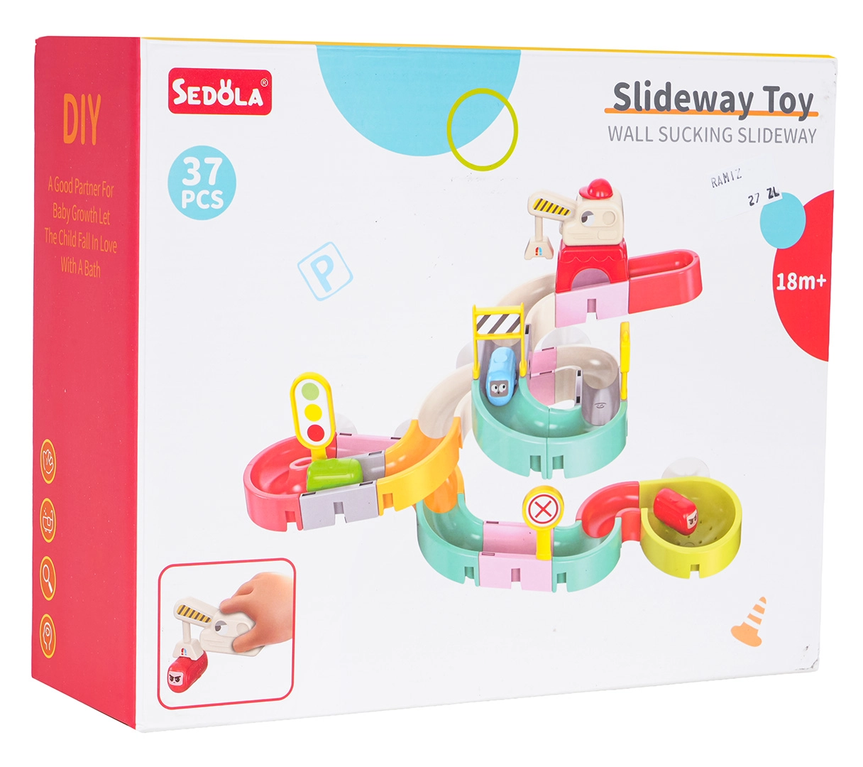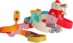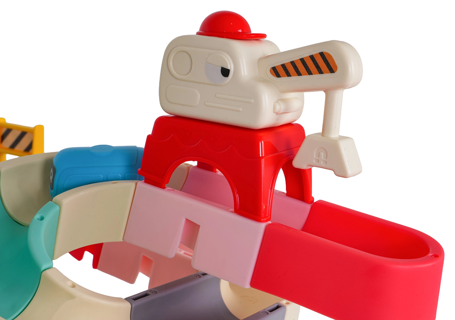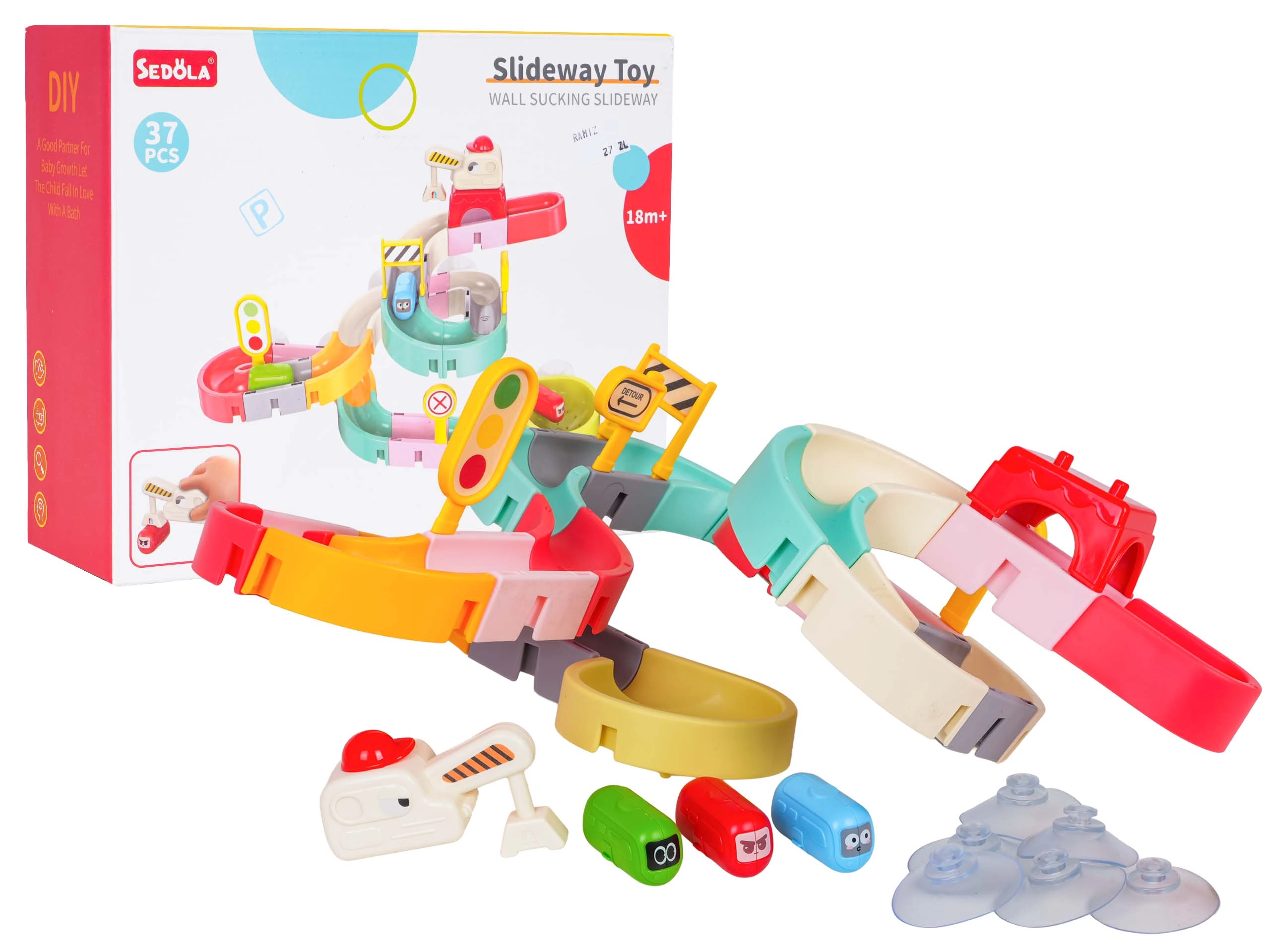 Lõbu on turvaline ja mitmekesine: kvaliteetne plast ilma teravate servadeta, tugevad iminapad stabiilsuseks ja erksad värvid, mis innustavad lapsi looma üha uusi radu. Komplekti kuuluvad ka liiklusmärgid, tõkkepuud ja kleebised veelgi suurema loovuse jaoks.