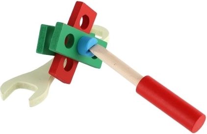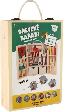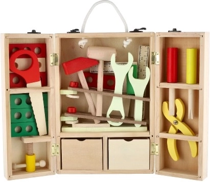 Avastage kvaliteetne puidust tööriistakohver, mis võimaldab lastel turvaliselt matkida täiskasvanute maailma. Komplektist leiab kruvikeerajad, haamri, võtmed, mutrid, kruvid, nurgiku, joonlaua, sae ja muud tarvikud. Kõik on korrapäraselt paigutatud tugevasse käepidemega kohvrisse, et seda oleks lihtne kaasas kanda.