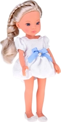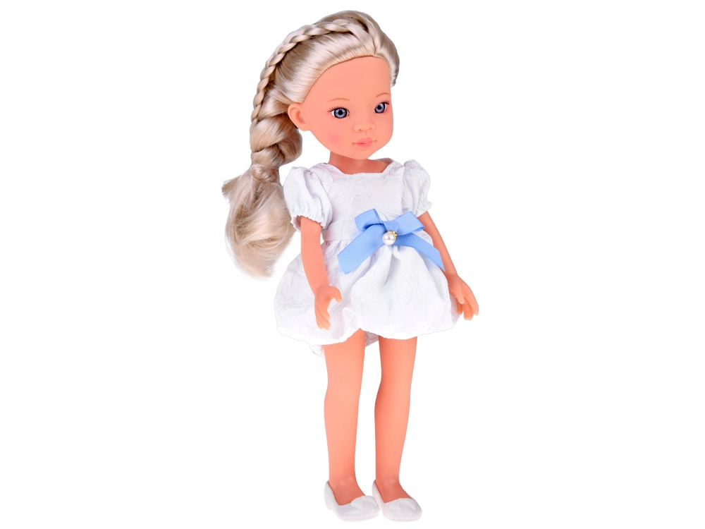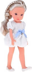 Komplekti kuuluvad kaunid valged kleidid sinise paela ja väikese pärlkaunistusega ning valged baleriinad. Detailirohke nägu väljendusrikaste, säravate silmadega annab nukule realistse ilme ja teeb temast ilusa kaaslase nii lastetoas kui ka kollektsioonis.