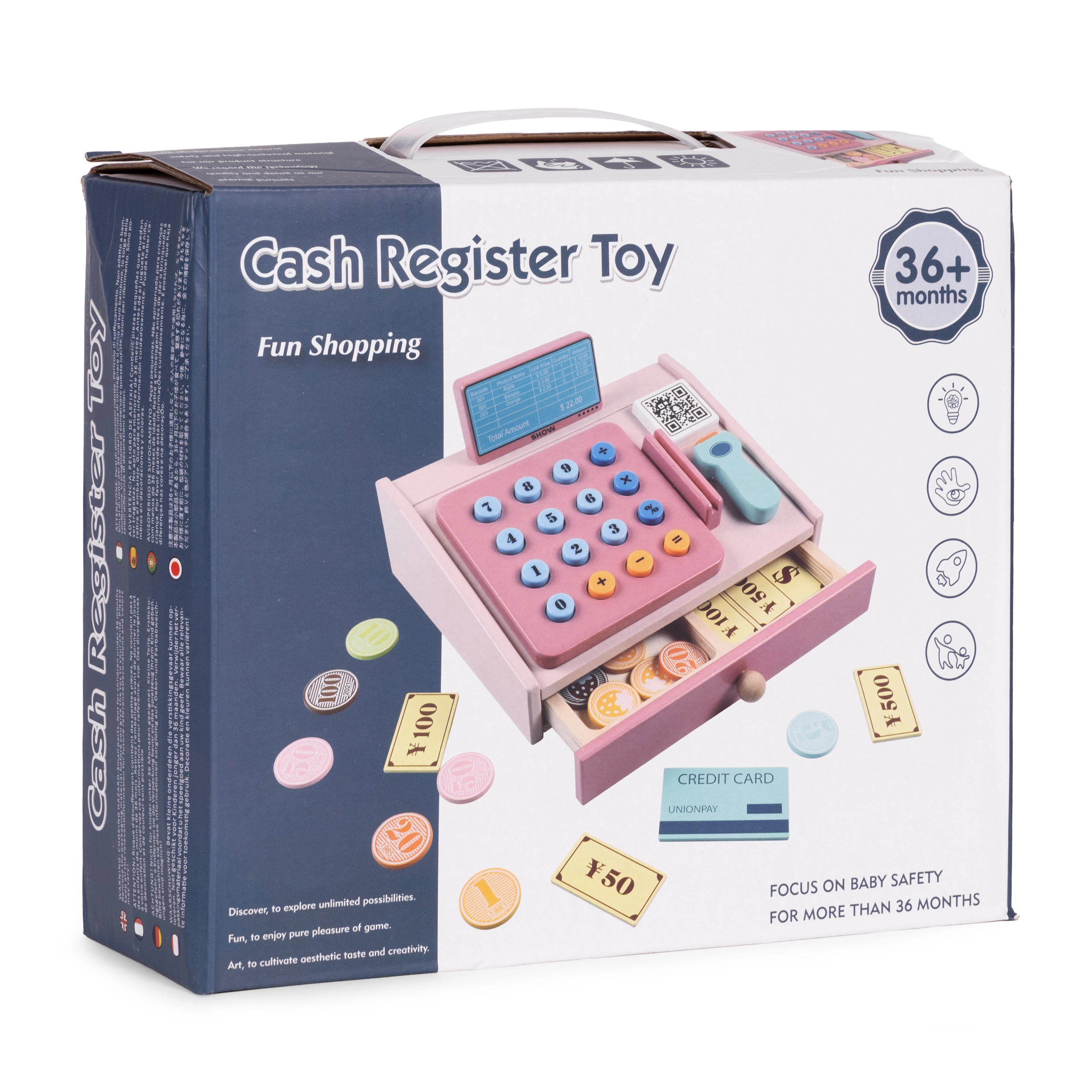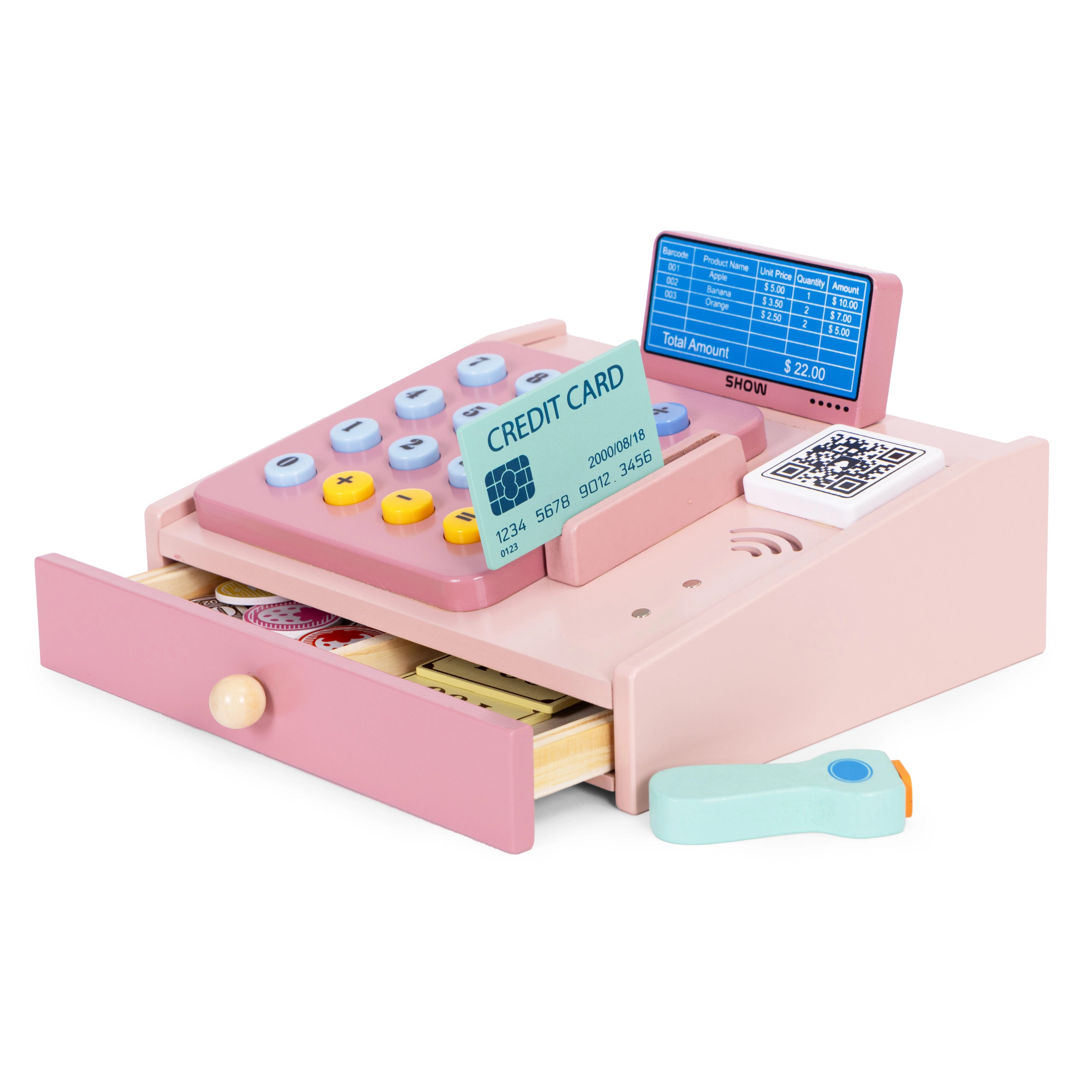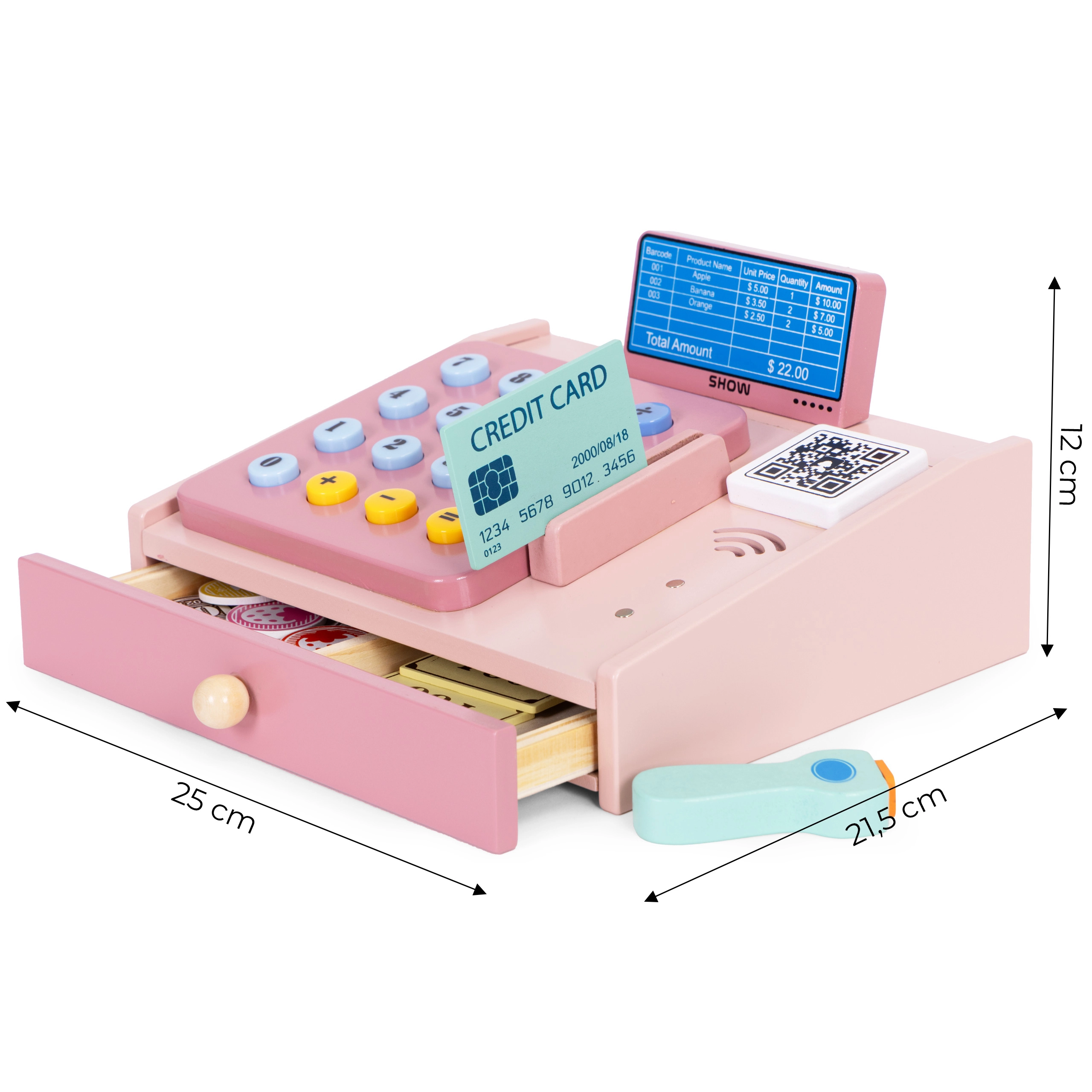 Väljatõmmatav sahtel hoiab paberraha ja münte, nii et lapsed saavad harjutada raha sortimist ja lugemist ning kassalaeka korrastamist.