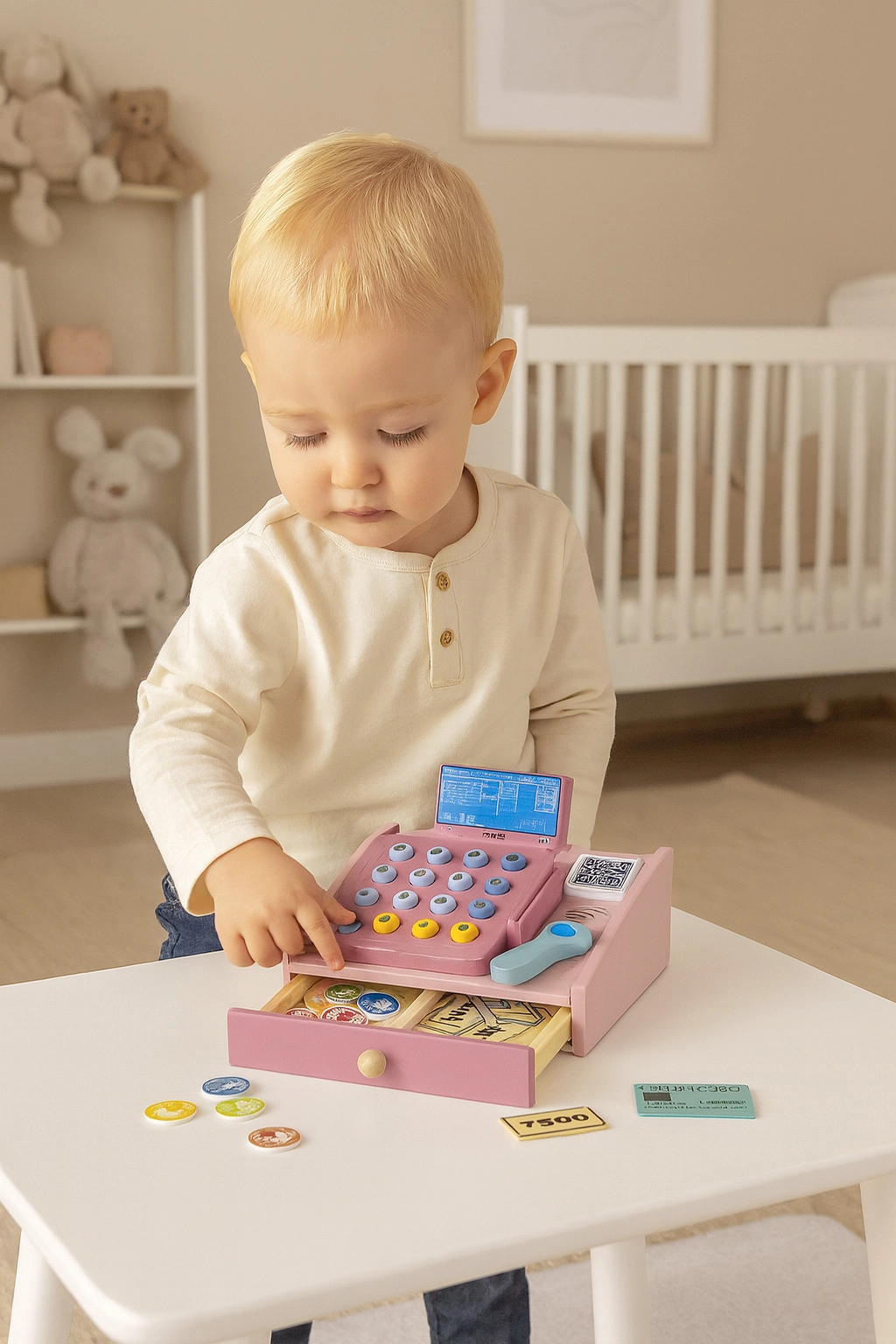 See kvaliteetne puidust kassamasin mahedates pastelltoonides on ideaalne täiendus lastenurka ja -tuppa. Realistlikud elemendid nagu käsiskanner, makseterminal, nuppudega klaviatuur ja väljatõmmatav sahtel muudavad poemängu lõbusaks ja harivaks tegevuseks. Lapsed harjutavad põhimatemaatikat, loogilist mõtlemist ja suhtlemist.