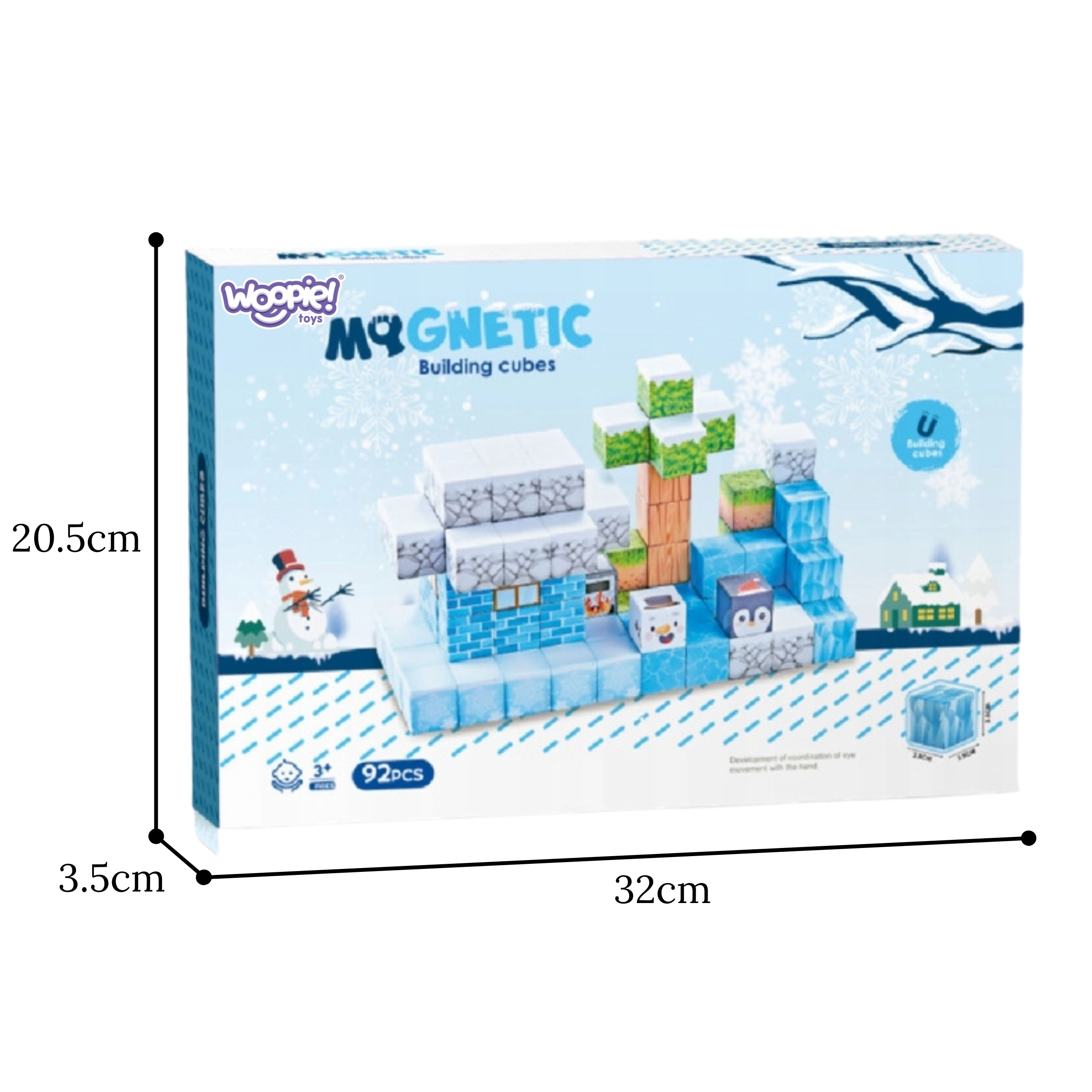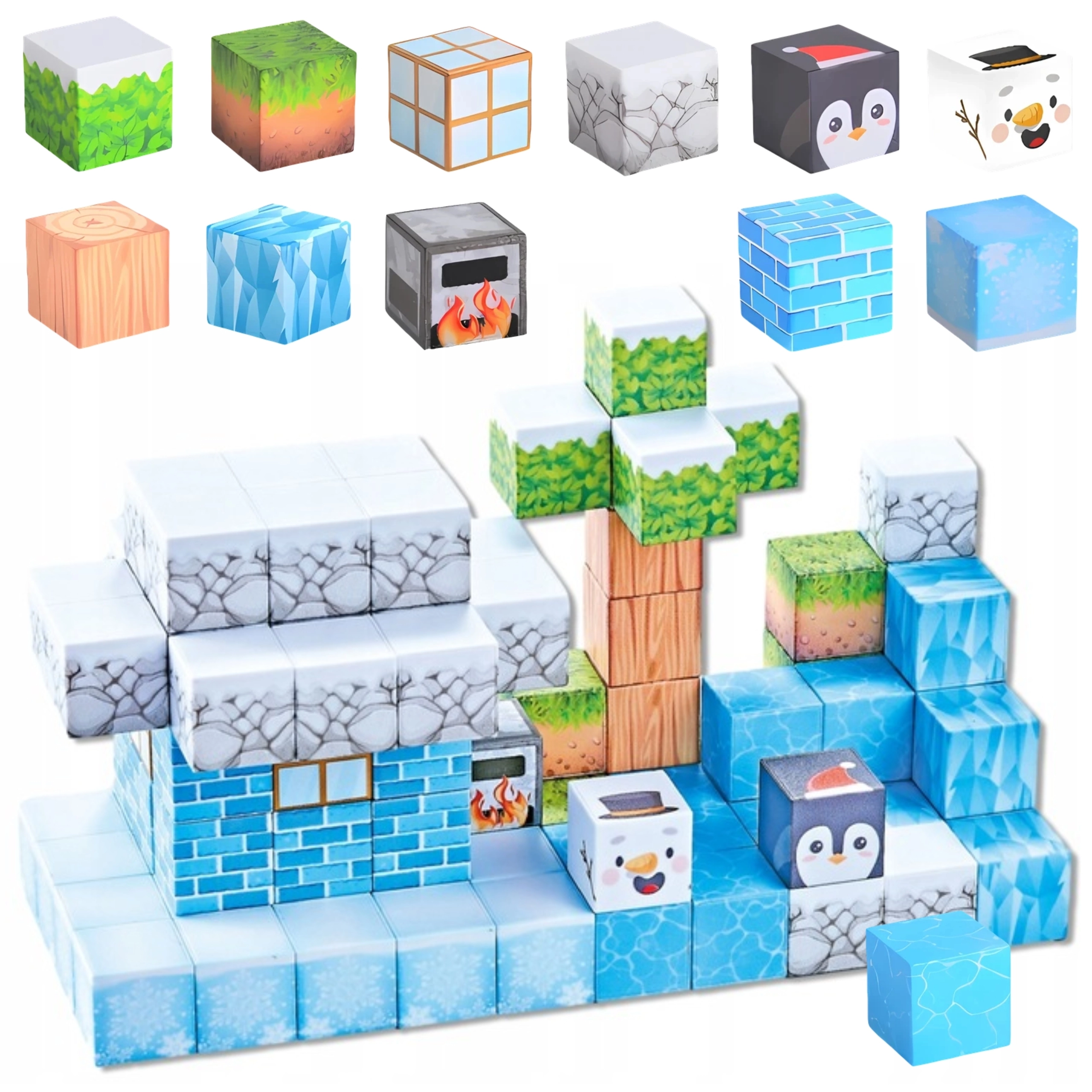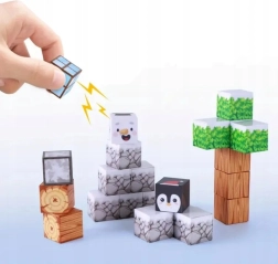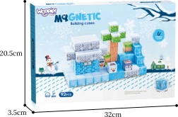See 66-osaline talvestelementidega magnetklotside komplekt rõõmustab väikseid ehitajaid jää, kivi, puidu, lehtede ja polaarloomade mustritega. Iga klots on mõõtudega 2,5 × 2,5 × 2,5 cm ning tänu sisseehitatud magnetitele haakuvad tükid kindlalt, nii et konstruktsioon püsib ilma liimi või lisakinnitusteta.