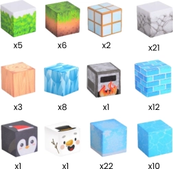 - 6× klots (jää muster); 14× klots (kivi muster); 3× klots (puidu muster); 16× klots (lehtede muster); 18× klots (sinise jää muster); 3× klots (pingviini muster); 1× klots (jääkaru muster); 13× klots (lumega kaetud kivi muster); 1× klots (kivikese/ahju muster); 1× klots (määramata mustriga)