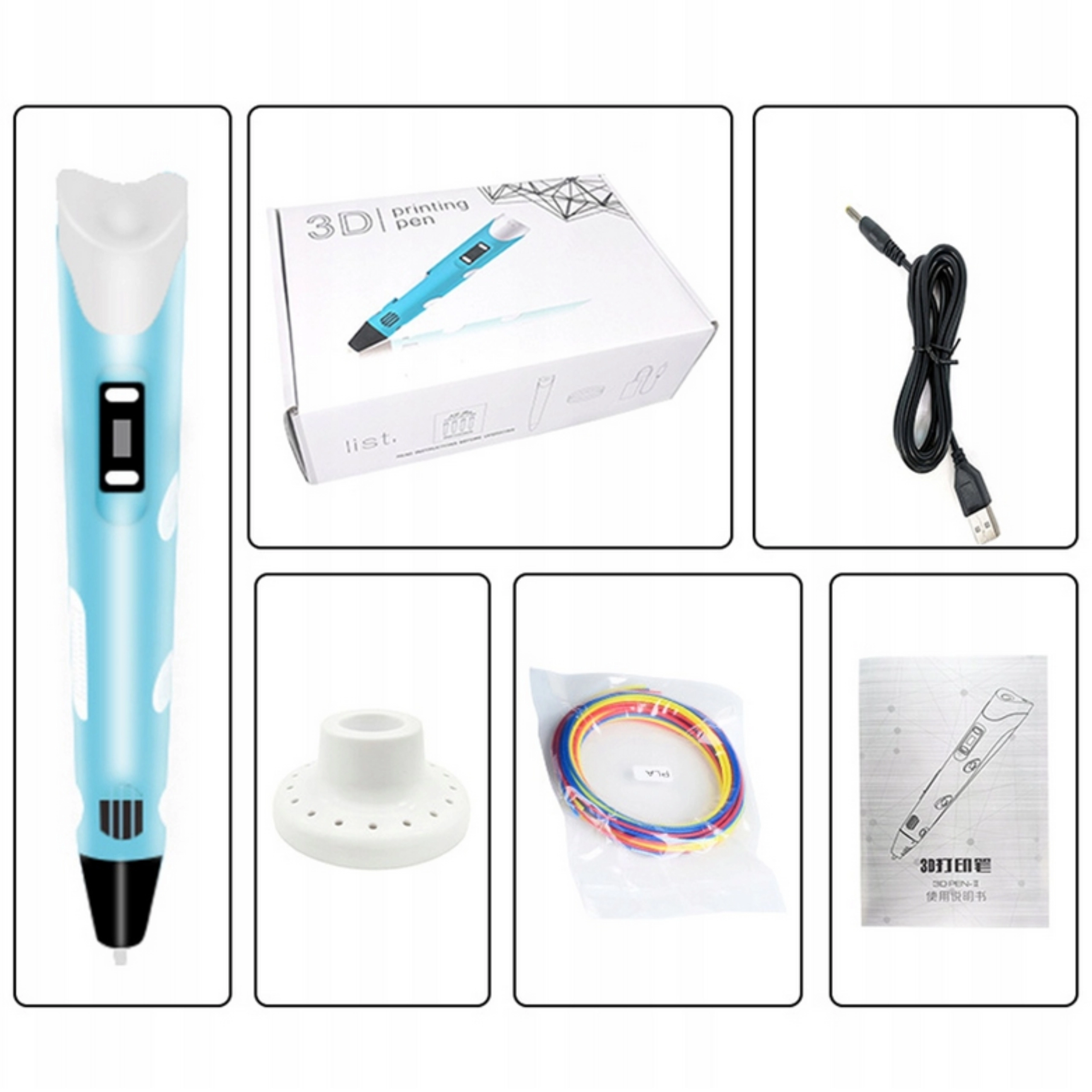 - 3D-pliiats (1 tk), PLA-filament 12 × 3 m (erinevad värvid), USB-kaabel (1 tk), juhend (EN)