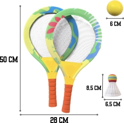 Pakendis on kõik, mida on vaja koheseks mänguks: 2 suurt reketit, vahust pall ja värviline sulgpall pehme otsaga. Mugavad vahust käepidemed on libisemisvastased ja sobivad hästi lapse käele. Komplekt sobib suurepäraselt aeda, hoovi, randa ja ka siseruumidesse.