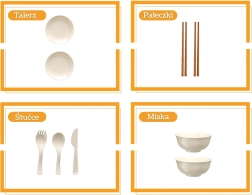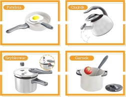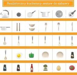 - Potid kaante ja käepidemetega, pann praemunaga, teekann, taldrikud, kausid, söögiriistad (kahvlid, lusikad, pulgad, pöördlabidad), soolatops, pipratops, köögiviljad (tomat, paprika), kastmete/maitseainete pudelid