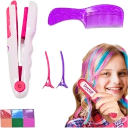 See loominguline komplekt sobib suurepäraselt lastele, kes armastavad stiilimuutusi ja soovivad luua oma originaalseid soenguid. Värvi pealekandmise sirgendaja ja erksavärviliste kriitide abil sünnivad hetkega efektsed mitmevärvilised salgud, mis pesed veega kergesti maha, nii et saad katsetada üha uuesti.