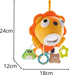 Lõvi kehal on 3 juhtnuppu taustvalgustuse sisse- ja väljalülitamiseks, meloodiate vahetamiseks ning helitugevuse reguleerimiseks. Komplekti kuuluvad riputatavad elemendid erineva kujuga – sealhulgas närimisrõngas ja kõristi – ning ka peegel, mis toetab avastamist ning silma-käe koordinatsiooni.