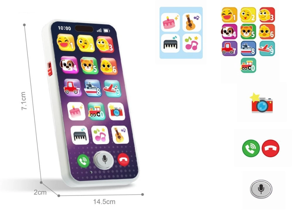 Interaktiivne lastesmartfon ühendab lõbu ja õppimise. Tänu nuppudele 0–9 ja temaatilistele ikoonidele harjutavad lapsed numbreid, helide äratundmist ja rütmi. Kahekordne helirežiim igal nupul hoiab mängu mitmekesise ja toetab kuulmise, kõne ning koordinatsiooni arengut.