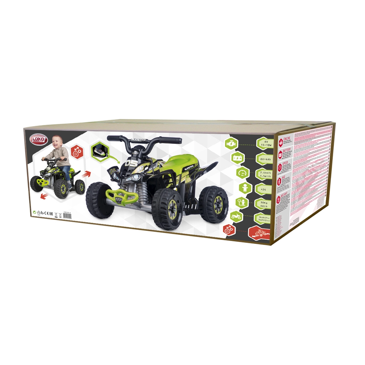 7,4 V aku (15–18 W, 3 Ah) tagab sujuva veojõu maksimaalse kiirusega 2,4 km/h – ideaalne tempo õppimiseks ja turvaliseks mänguks. Tugev konstruktsioon kandevõimega kuni 30 kg teeb sellest neljarattalisest usaldusväärse kaaslase nii hoovi kui ka parki.