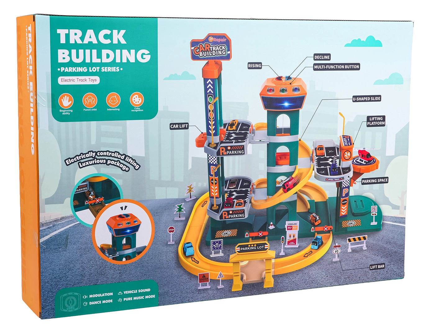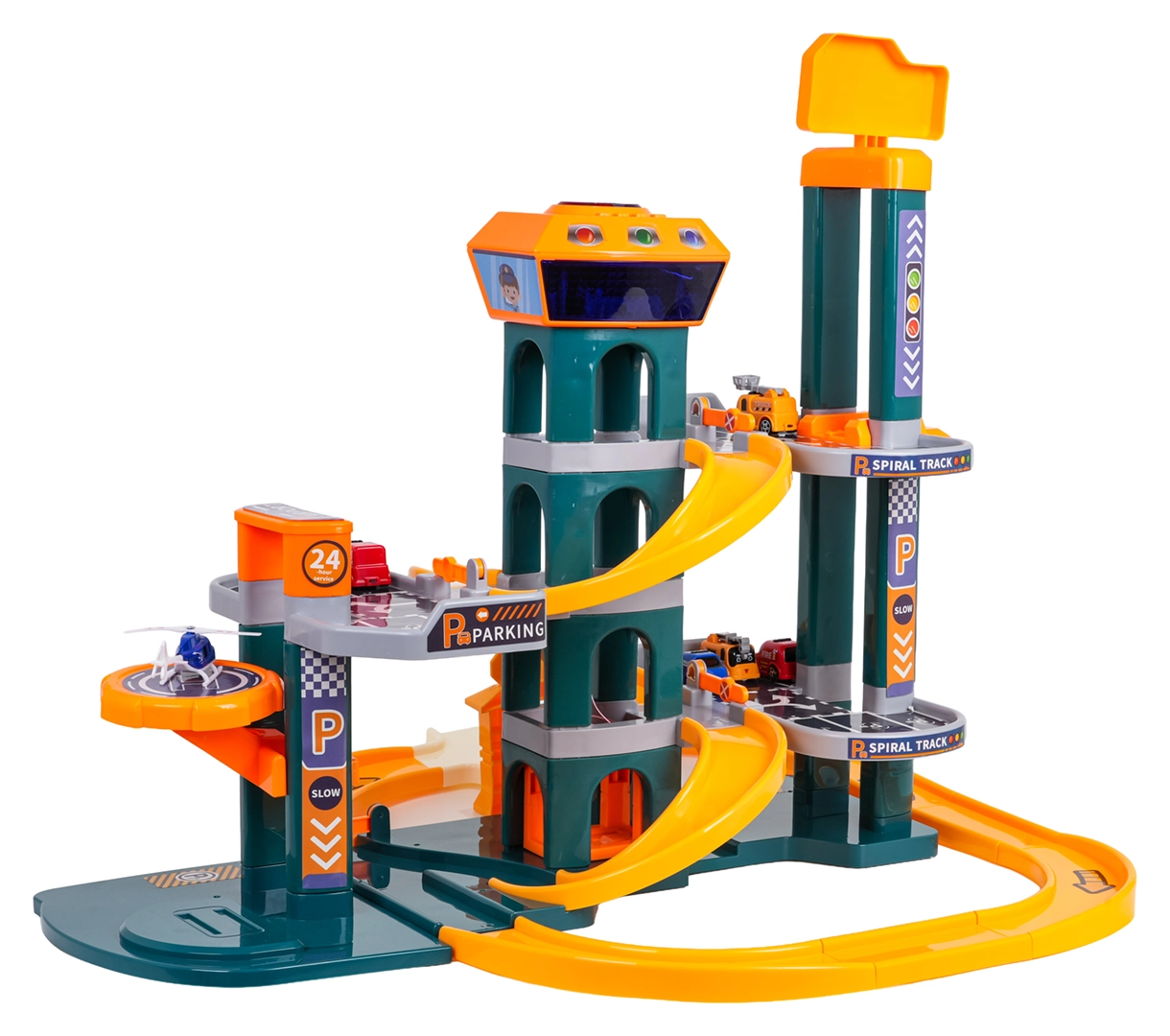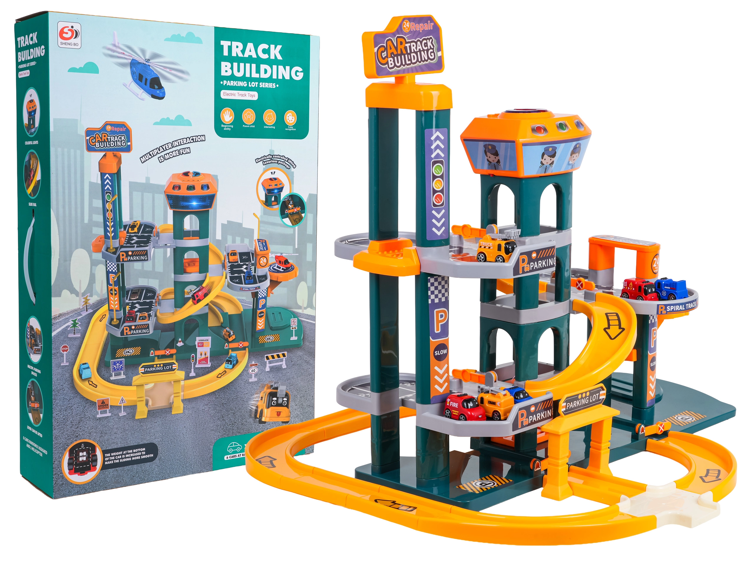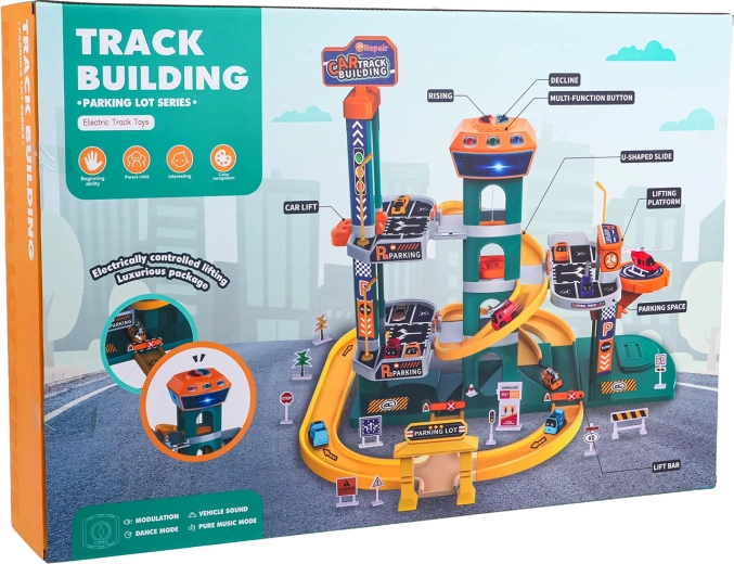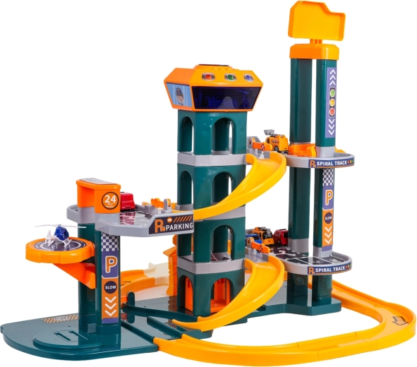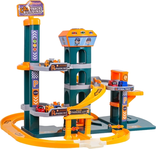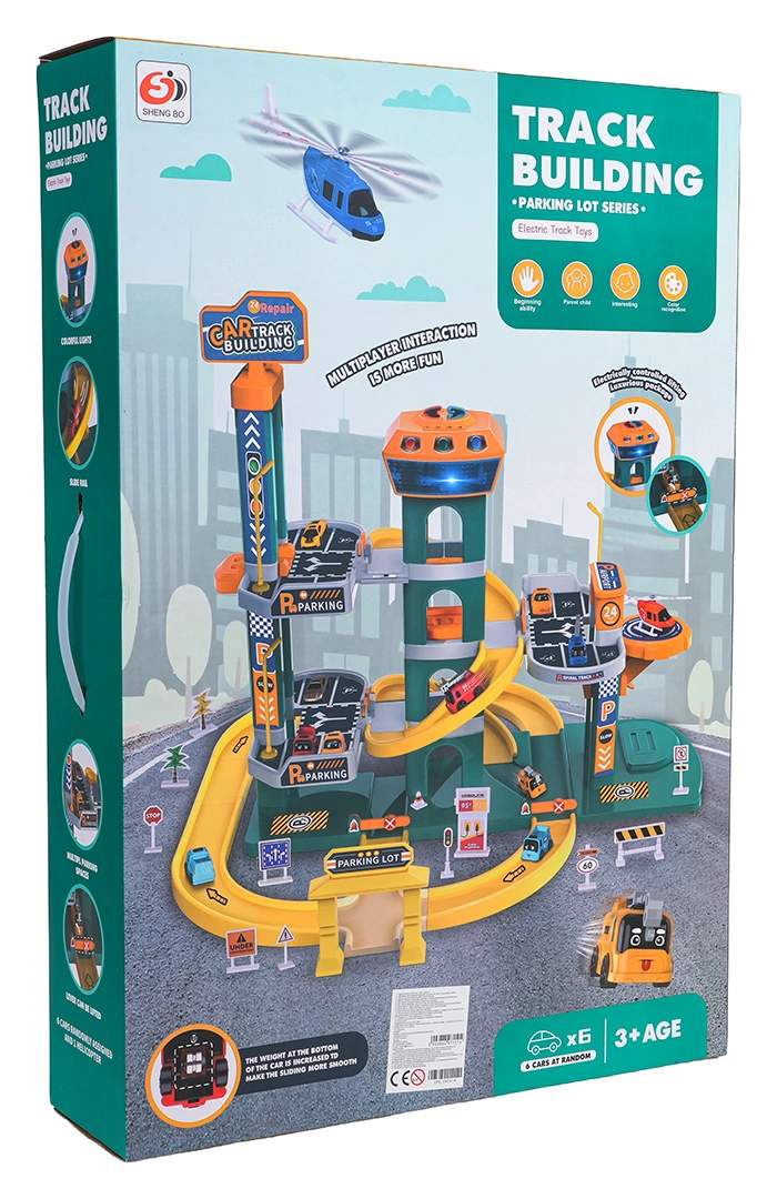 Avastage suur kahekorruseline parklakomplekt lastele alates 3. eluaastast, millel on valgus- ja heliefektid, automaatne lift ning rikkalik lisavarustus. Värvikirev komplekt kvaliteetsest ja ohutust plastist pakub spiraalseid laskumisi, juhtpaneeli lõbusate meloodiate, sõidukite helide ja vilkuvate nuppudega ning samuti 6 autot ja helikopteri tundideks loovaks mänguks.