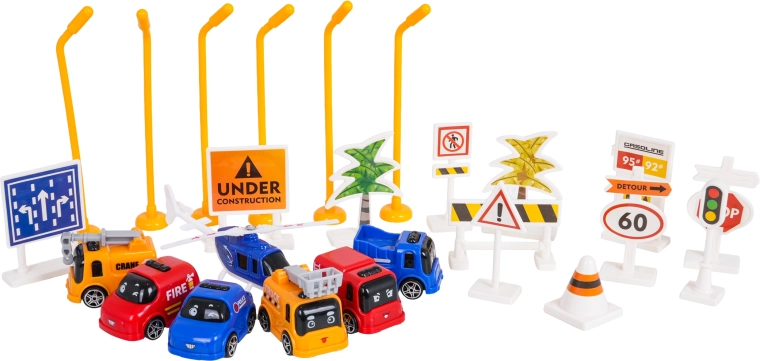 Komplektis on mini-sõidukid (politsei, tuletõrje, tõstukid), helikopter, liiklusmärgid, tõkkepuud ja lambid – kõik realistlike liiklusstseenide jaoks.