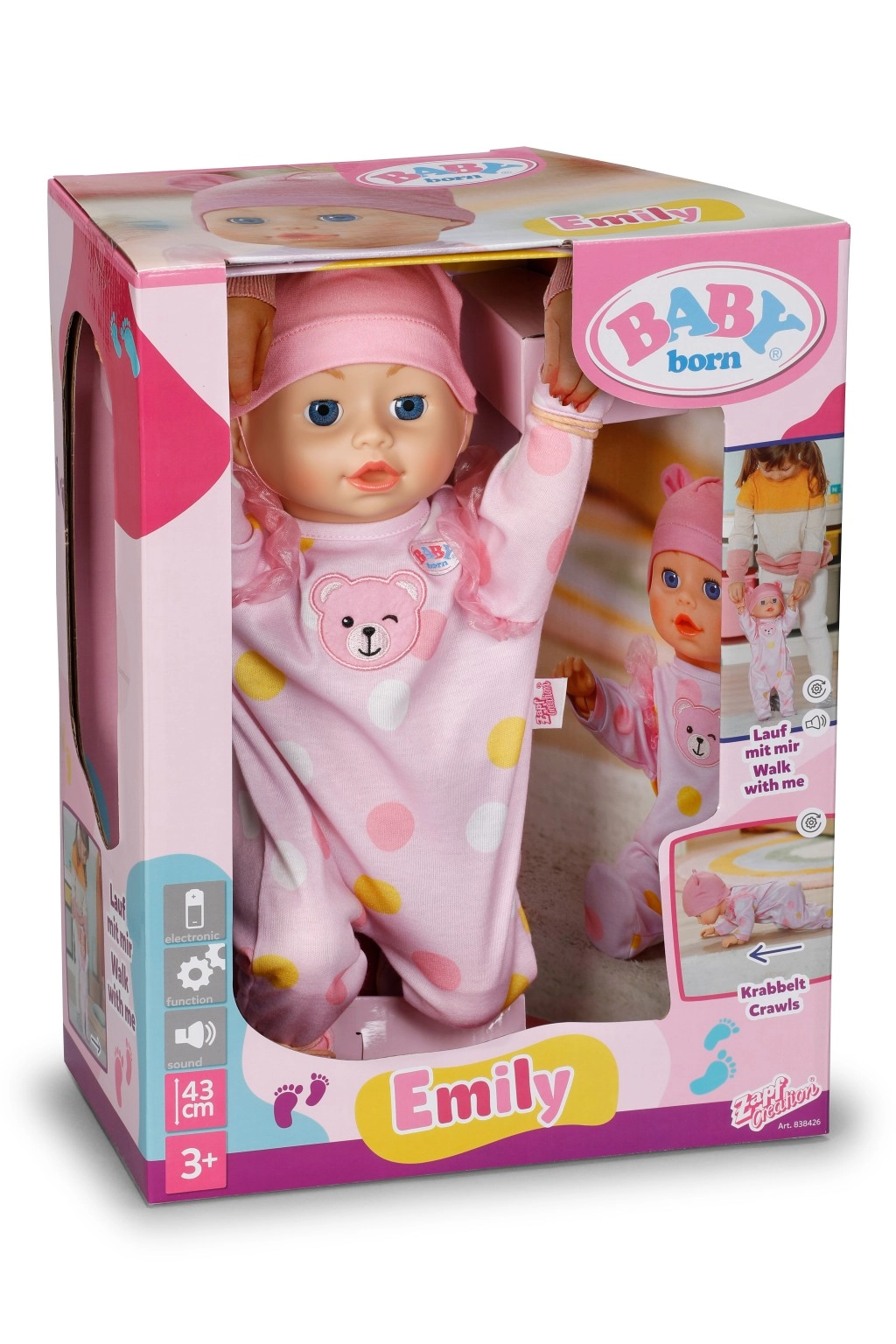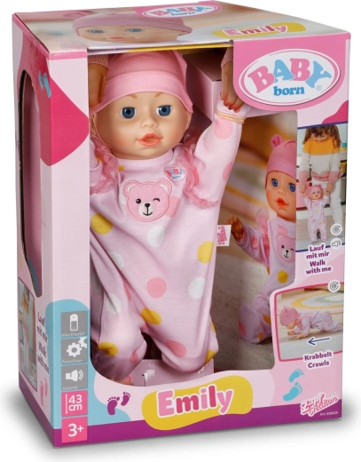 Nukk BABY born Emily julgustab lapsi liikuma ja loovust kasutama – lihtne ja ohutu mehhanism võimaldab nukul joosta ning mööda põrandat roomata. Lapsed saavad matkida beebihooldust, välja mõelda lugusid ning samal ajal arendada nii peen- kui ka üldmotoorikat.