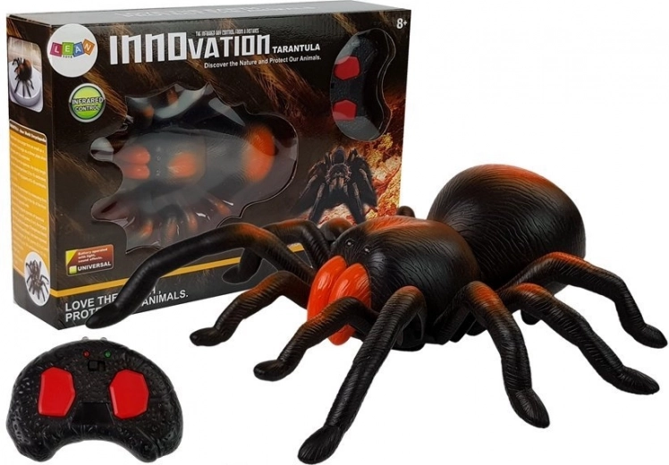 Hiiglaslik must‑oranž tarantel näeb esmapilgul välja nagu elus. See on valmistatud kvaliteetsest plastist, sellel on detailsed tekstuurid, helendavad silmad ja sujuv jalgade liikumine. Infrapuna‑puldi kahel suurel nupul: üks sujuvaks edasiliikumiseks ja teine kiireks pöördeks paremale. Ideaalne mängimiseks kodus, pidudel ning ka hirmutava dekoratsioonina.