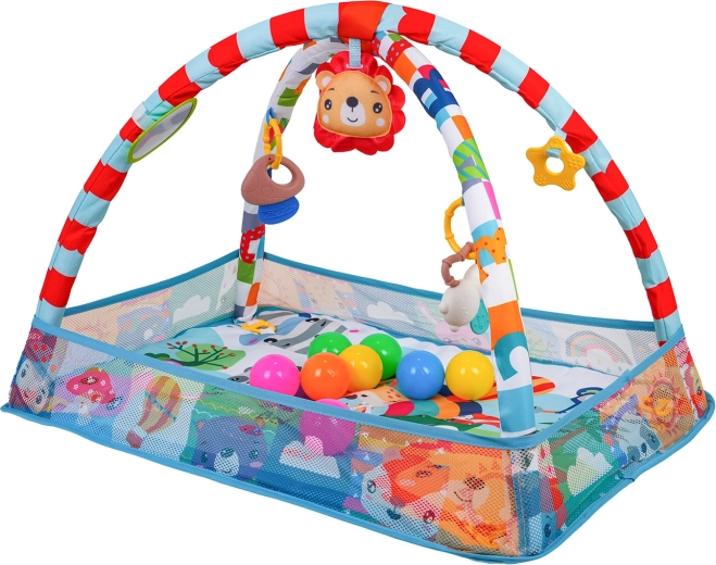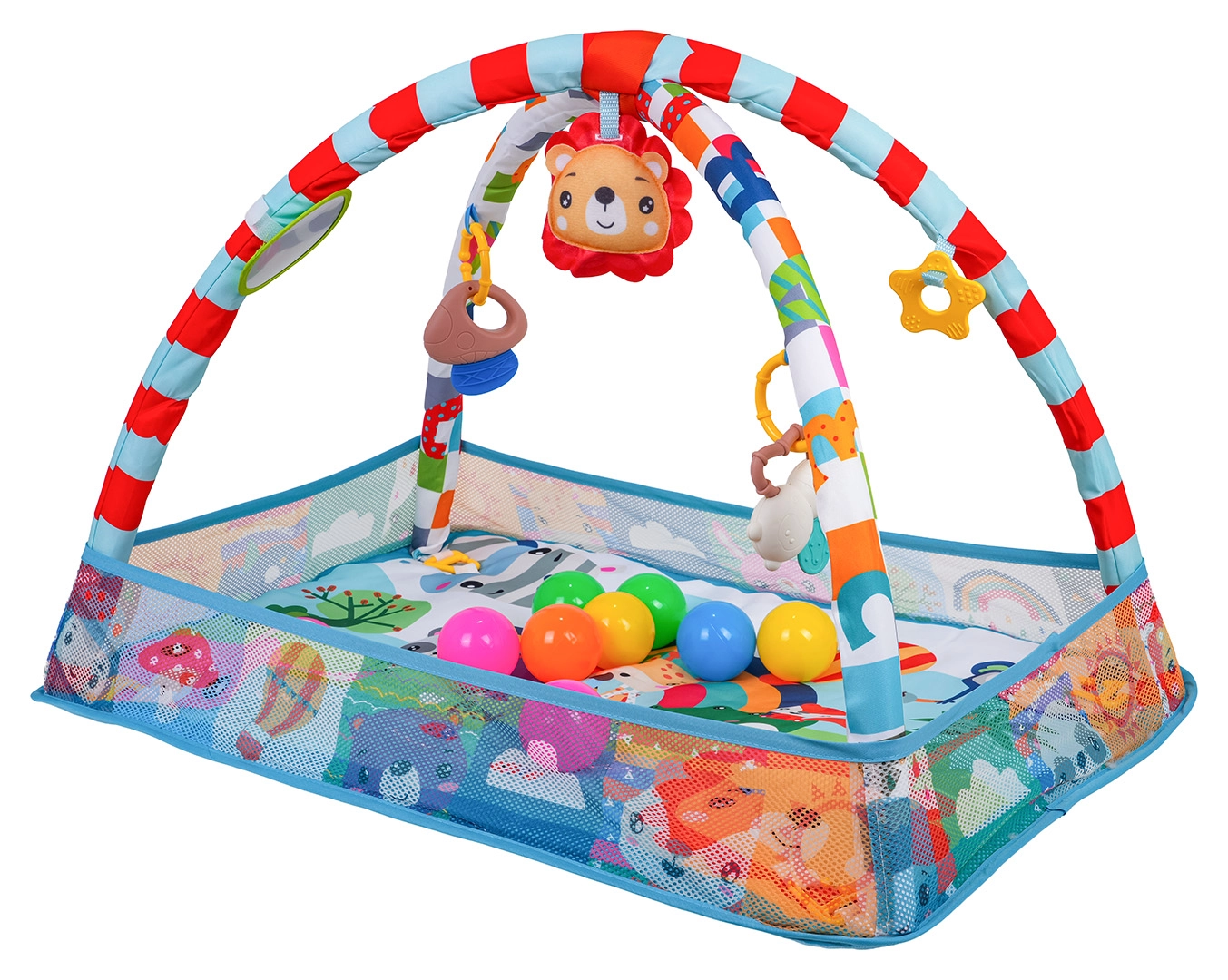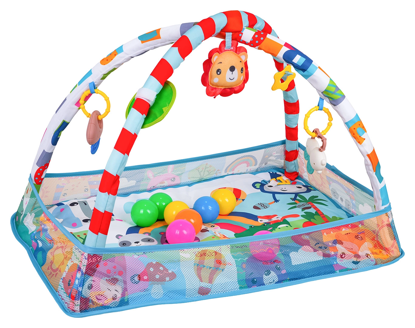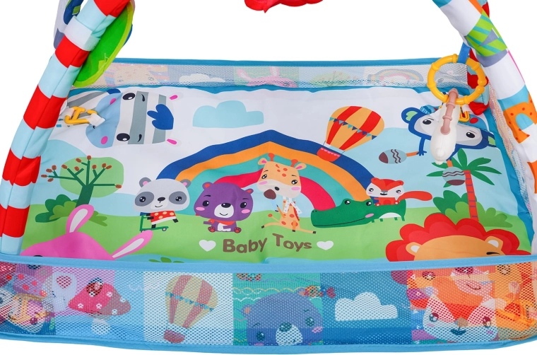 See värviline mängutekk loob turvalise ja stimuleeriva keskkonna meelte ja motoorika arenguks juba esimestest päevadest. Võrgust küljed hoiavad mänguasjad ja pallid paigal ning pakuvad beebile rahulikku ala selili olemiseks ja kõhutrenniks.