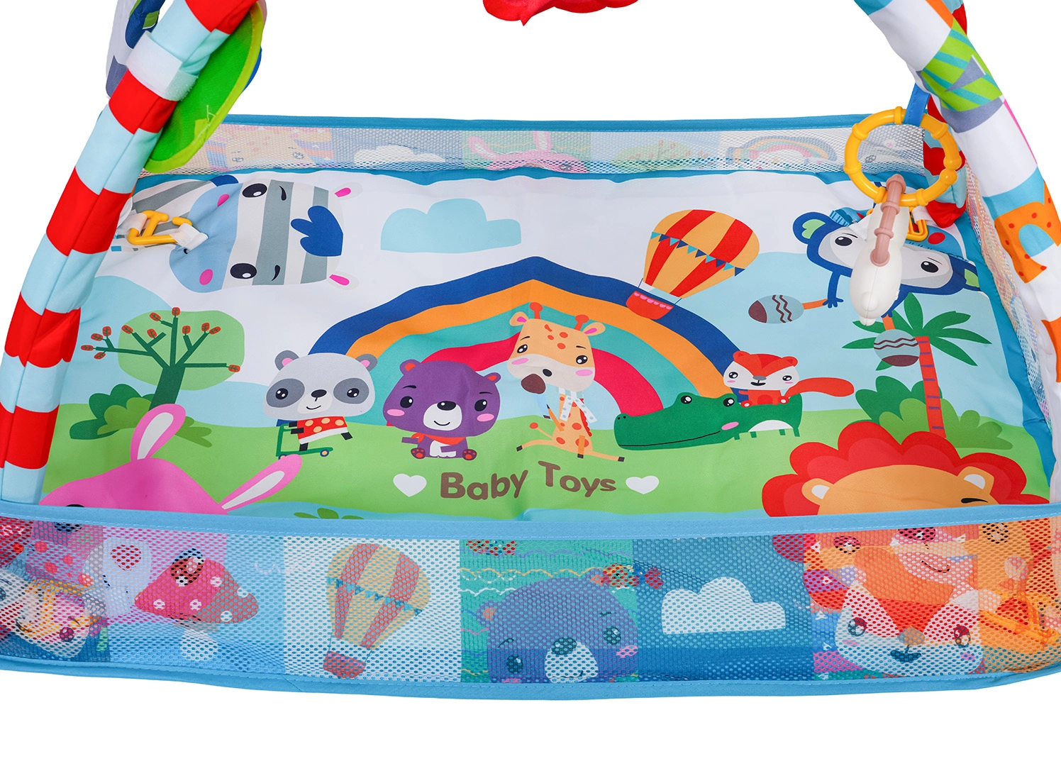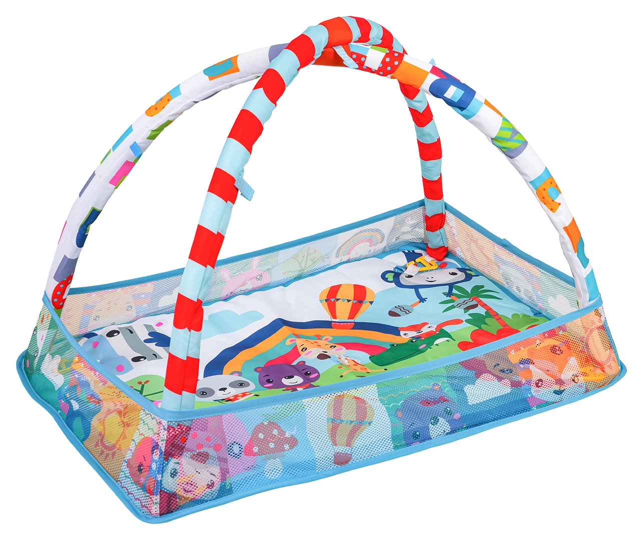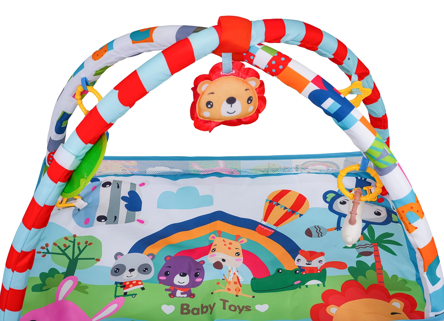 See värviline mängutekk loob turvalise ja stimuleeriva keskkonna meelte ja motoorika arenguks juba esimestest päevadest. Võrgust küljed hoiavad mänguasjad ja pallid paigal ning pakuvad beebile rahulikku ala selili olemiseks ja kõhutrenniks.