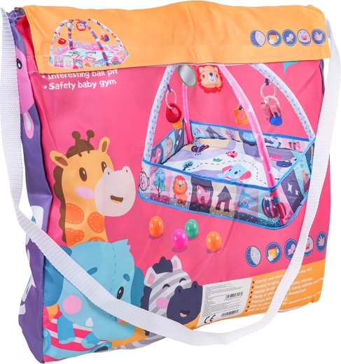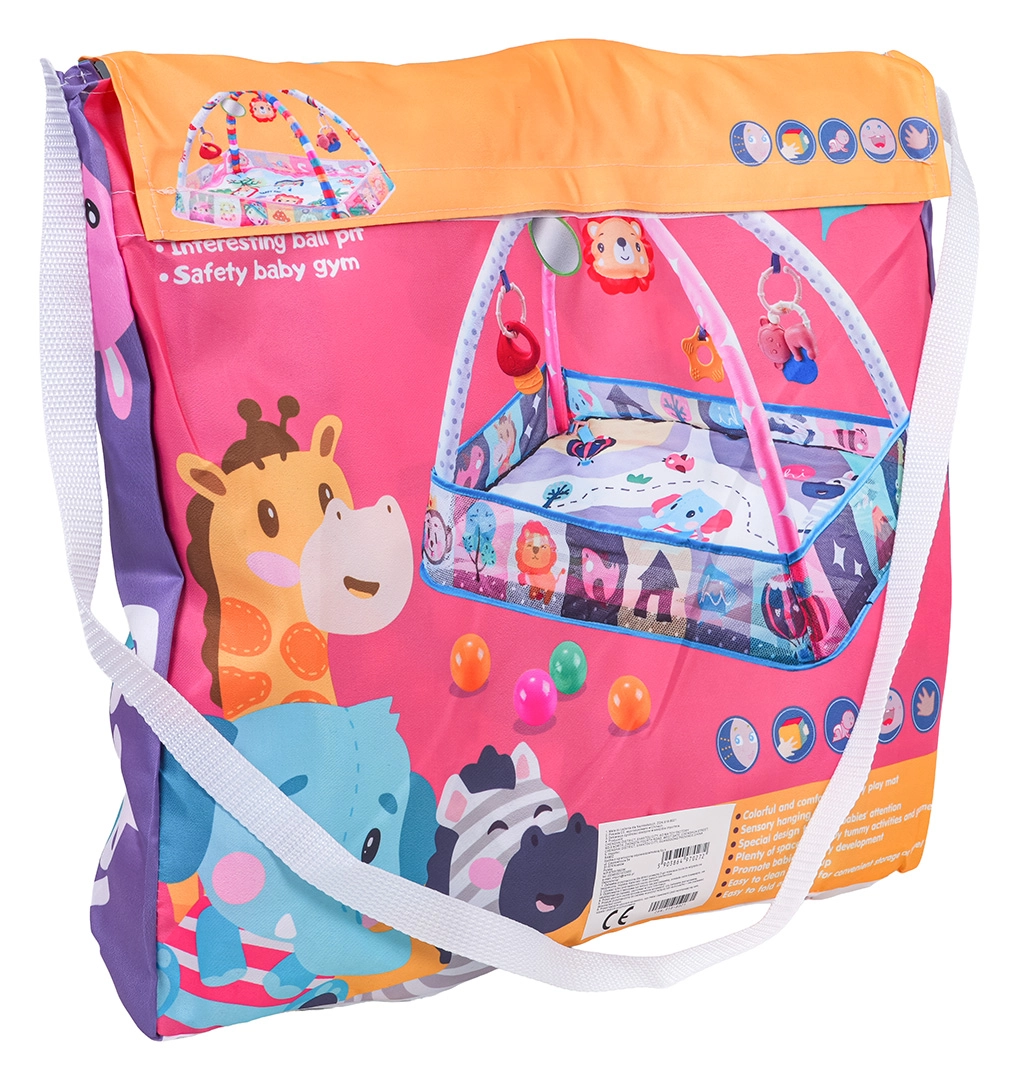 Komplektis: mängumatt riputatavate mänguasjadega, 8× plastpalli kuiva basseini jaoks ning värviline õlakott lihtsaks kandmiseks ja hoiustamiseks.