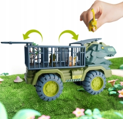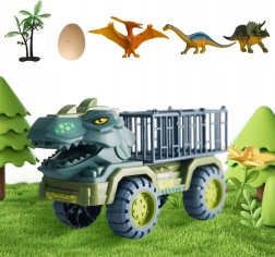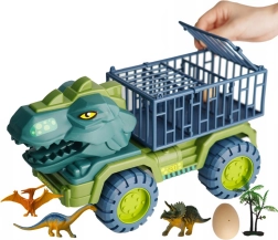 Komplektis: dinosaurusetransporter, 15 dinosauruse figuuri, dinosaurusmuna, dekoratsioonid (puuke, kivid).