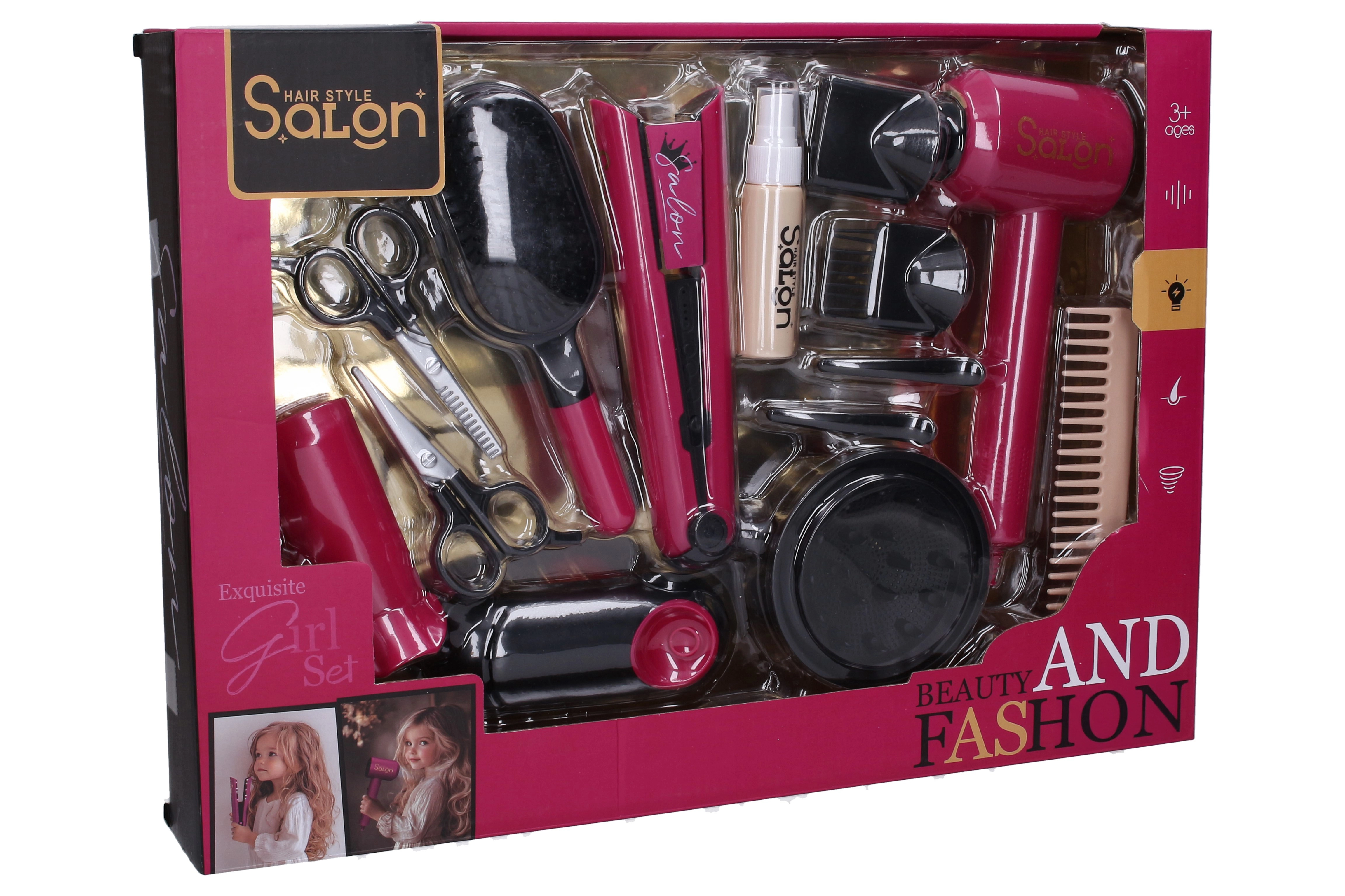 Stiilne kosmeetikakomplekt väikestele moegurmaanidele toob kõik vajaliku juuksuris mängimiseks. Komplektis on föön, juuksesirgendaja, hari, kamm, käärid, klambrid ja muud aksessuaarid. Föön ja sirgendaja töötavad patareidega (ei kuulu komplekti), nii et lapsed saavad kogeda realistlikku mängu ning arendada loomingulisust ja peenmotoorikat.