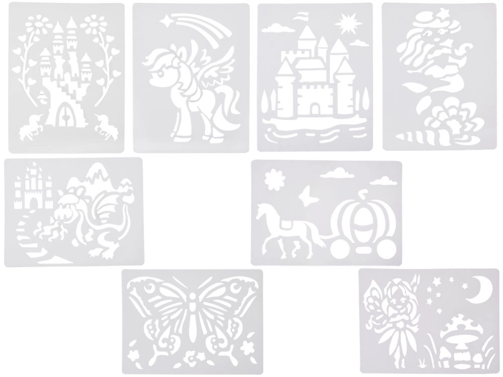 Komplekti kuuluvad taaskasutatavad plastšabloonid populaarsete motiividega (nt. liblikas, lossid, draakon, merineitsi, hobune tõllaga, metsahaldjas, hobune/vars), 12 värvilist vildikat, 10 paberilehte ja maagiline pump. Pärast kasutamist lase šabloonidel kuivada ning loo jälle.