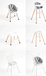 - 6-ühes: kõrge söögitool, madal tugitool, booster, iste ilma jalgadeta, baaritool, madal taburet