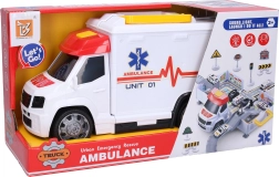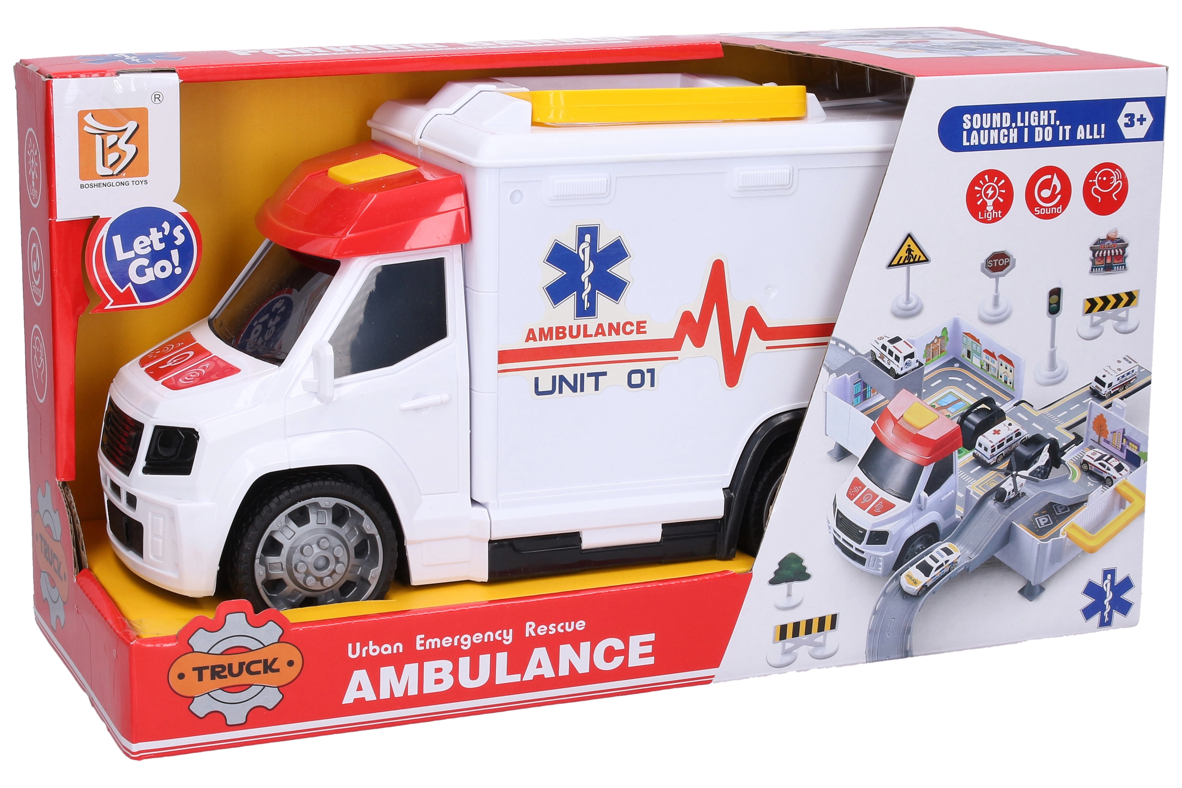 Lõbus ja realistlik kiirabi lahtikäiva haigla garaažiga pakub lastele tundidepikkust mängurõõmu. Sellel on valgus- ja heliefektid, aktiveerimine kapotil olevate nuppudega ning katusel suur nupp lukust lahti tegemiseks. Komplektis on toide 3× AG13. Vabalt veerevad rattad tagavad sujuva sõidu ja lahtivõtmisel tekib haigla mänguala väikeste autode ja liiklusmärkidega.