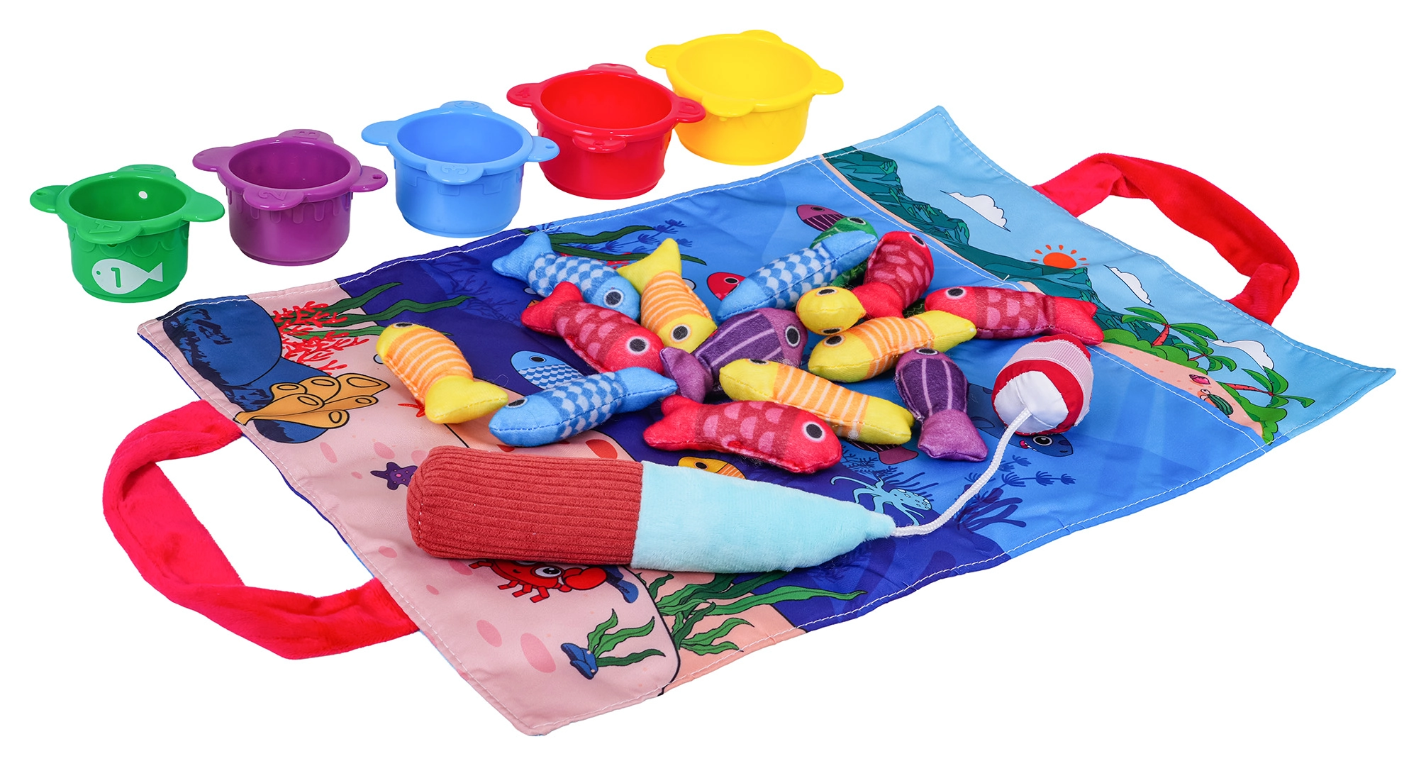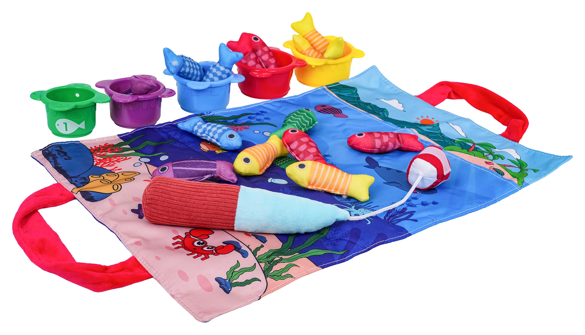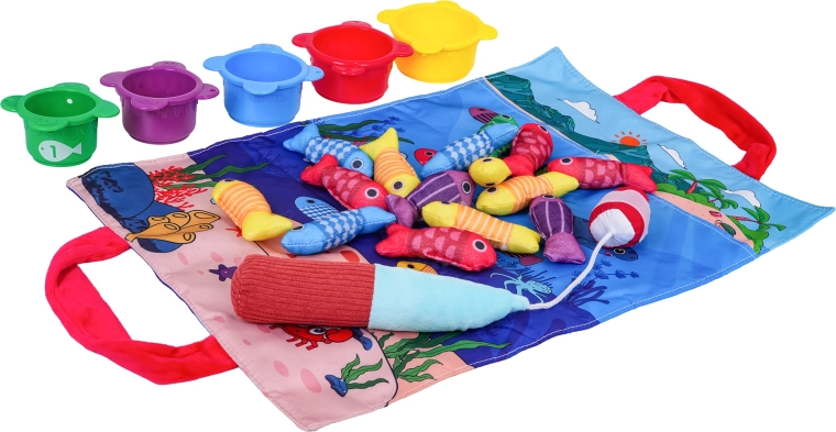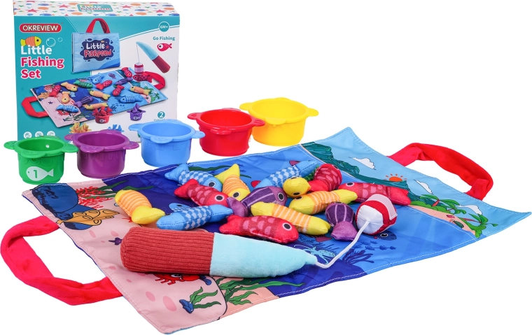 See pehme sensoorne kalapüügikomplekt on mõeldud lastele alates umbes 6. elukuust. Värviline merekujundusega tekstiilist alus, viies värvitoonis pehmed kalad, viis topsi numbritega 1–5 ja takjapaelaga pehme õng kutsuvad turvalisele ja lõbusale mängule. Lapsed püüavad kalu, panevad need värvi järgi vastavatesse topsidesse ning harjutavad samal ajal loendamist topsidel olevate numbrite järgi.