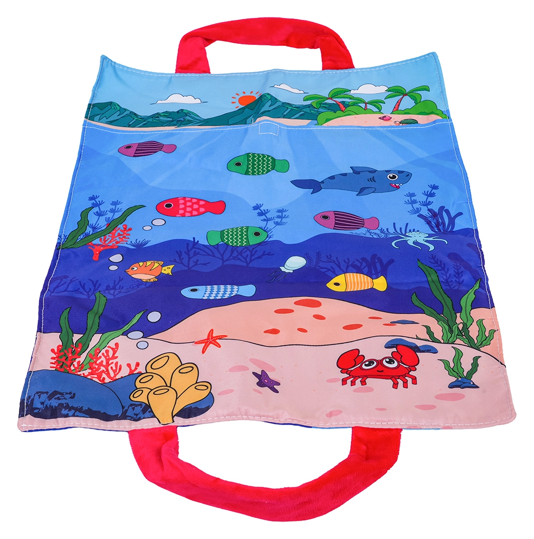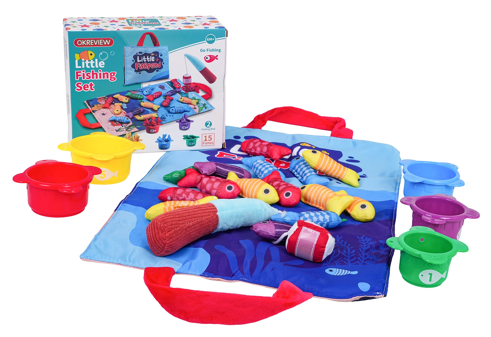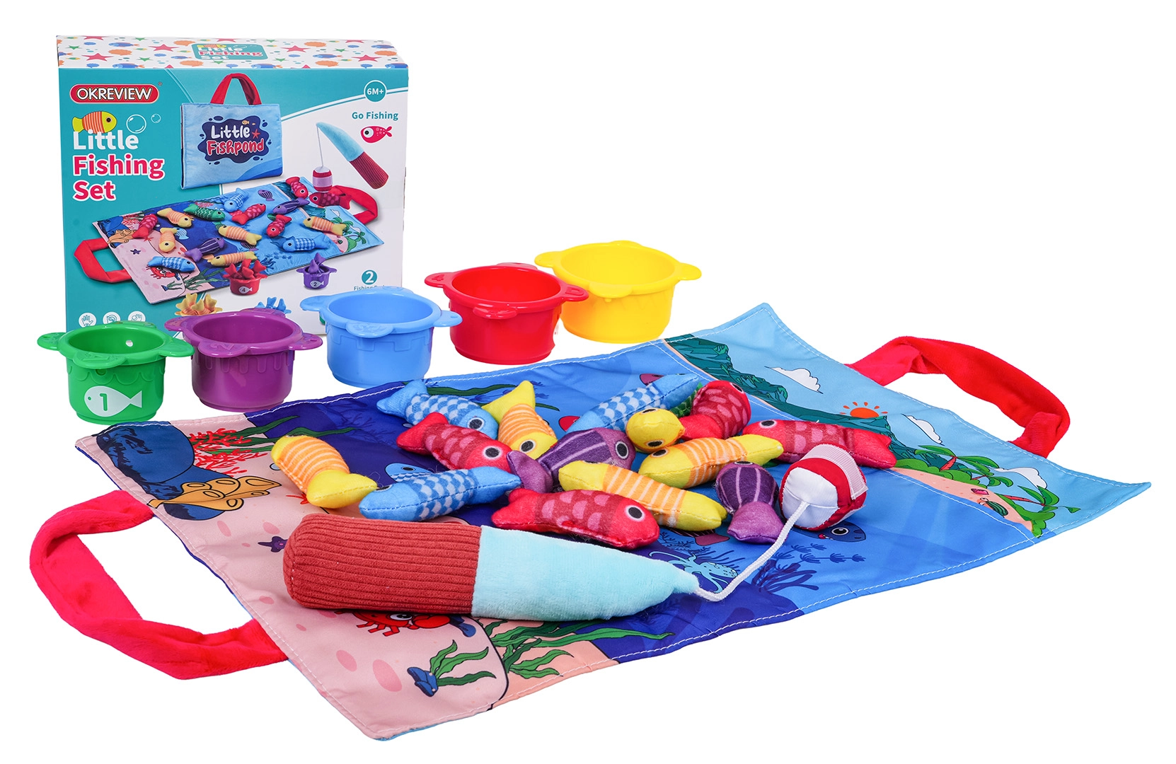 See pehme sensoorne kalapüügikomplekt on mõeldud lastele alates umbes 6. elukuust. Värviline merekujundusega tekstiilist alus, viies värvitoonis pehmed kalad, viis topsi numbritega 1–5 ja takjapaelaga pehme õng kutsuvad turvalisele ja lõbusale mängule. Lapsed püüavad kalu, panevad need värvi järgi vastavatesse topsidesse ning harjutavad samal ajal loendamist topsidel olevate numbrite järgi.