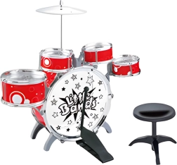 - 1× kesktrumm (bassitrumm) pedaaliga, 2× külgmine trumm (tomid), 1× taldrik, 2× trummipulka, kinnitusdetailid