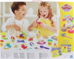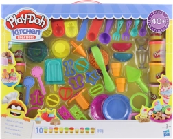 - Täielik varustus – 10 suurt modelleerimismassi topsi ja 40 tarvikut (vormid, lõikurid, nõud).