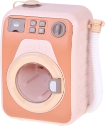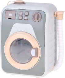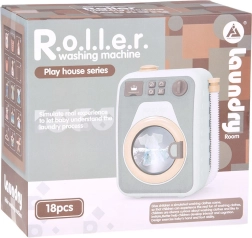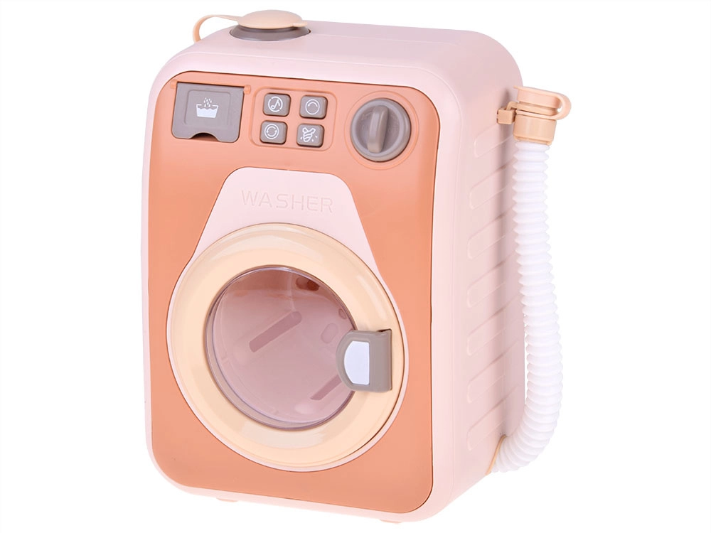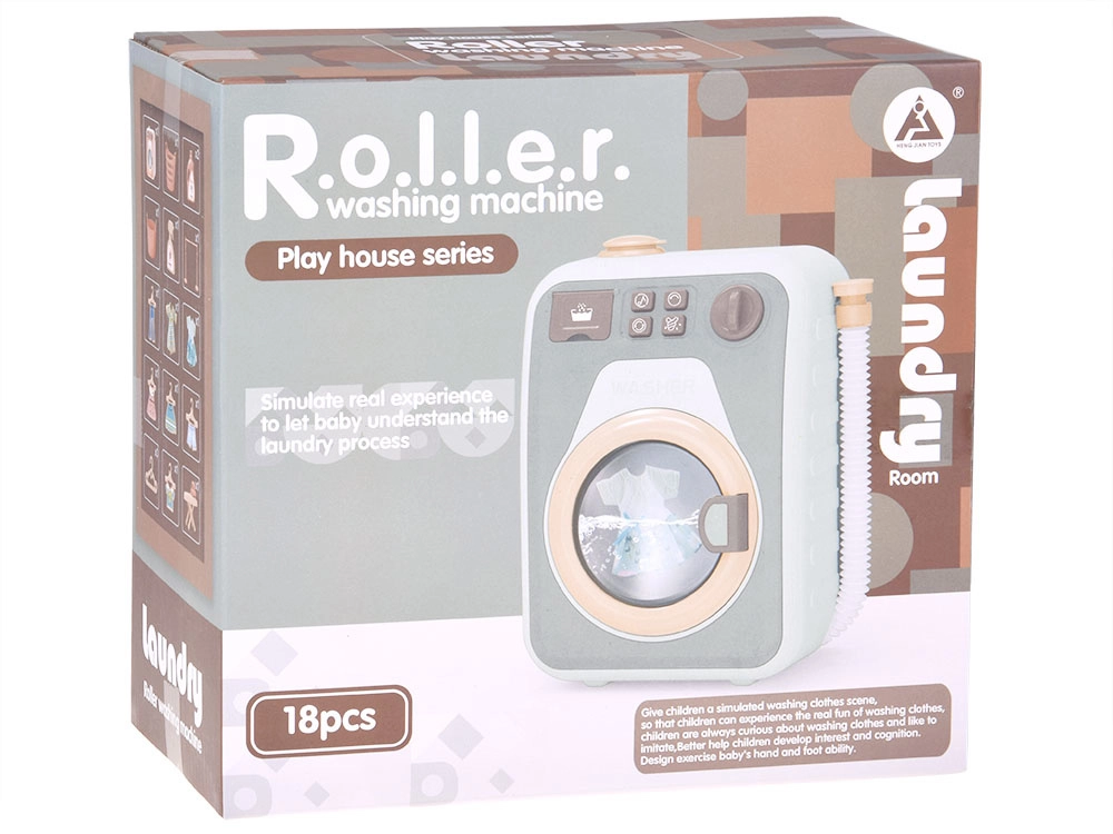 See interaktiivne 2‑ühes pesumasin kuivatiga pastelltoonides matkib tõetruult päris kodumasinaid: on juhtpaneel, nupud, pöördlüliti, avatav trummel ning sahtlid pesupulbri ja vee jaoks. Lapsed saavad „päriselt” pesta – täita trumli veega, käivitada programmi ja lõpuks lasta vee välja vooliku abil, millel on sulgur.